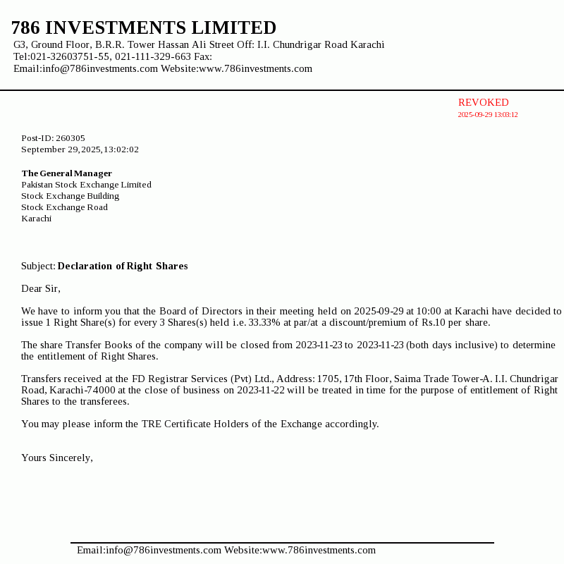 | 2025-09-29 | Declaration of Right Shares 786 Investments Limited | Image PDF |