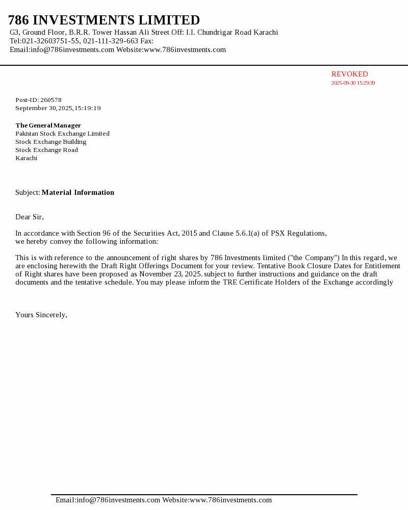 | 2025-12-04 | Notice of Book Closure pertaining to Right Issue 786 Investments Limited | Image PDF |