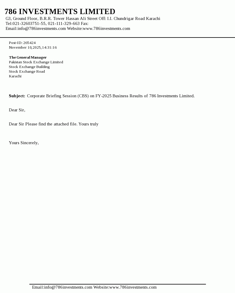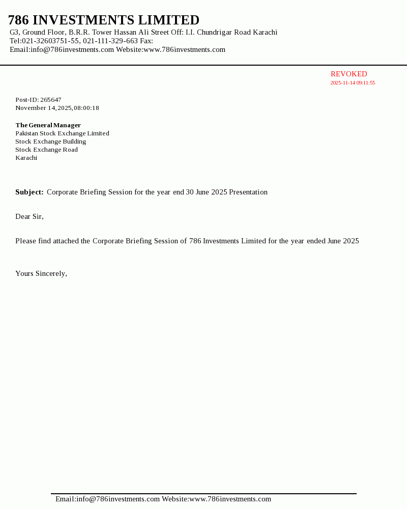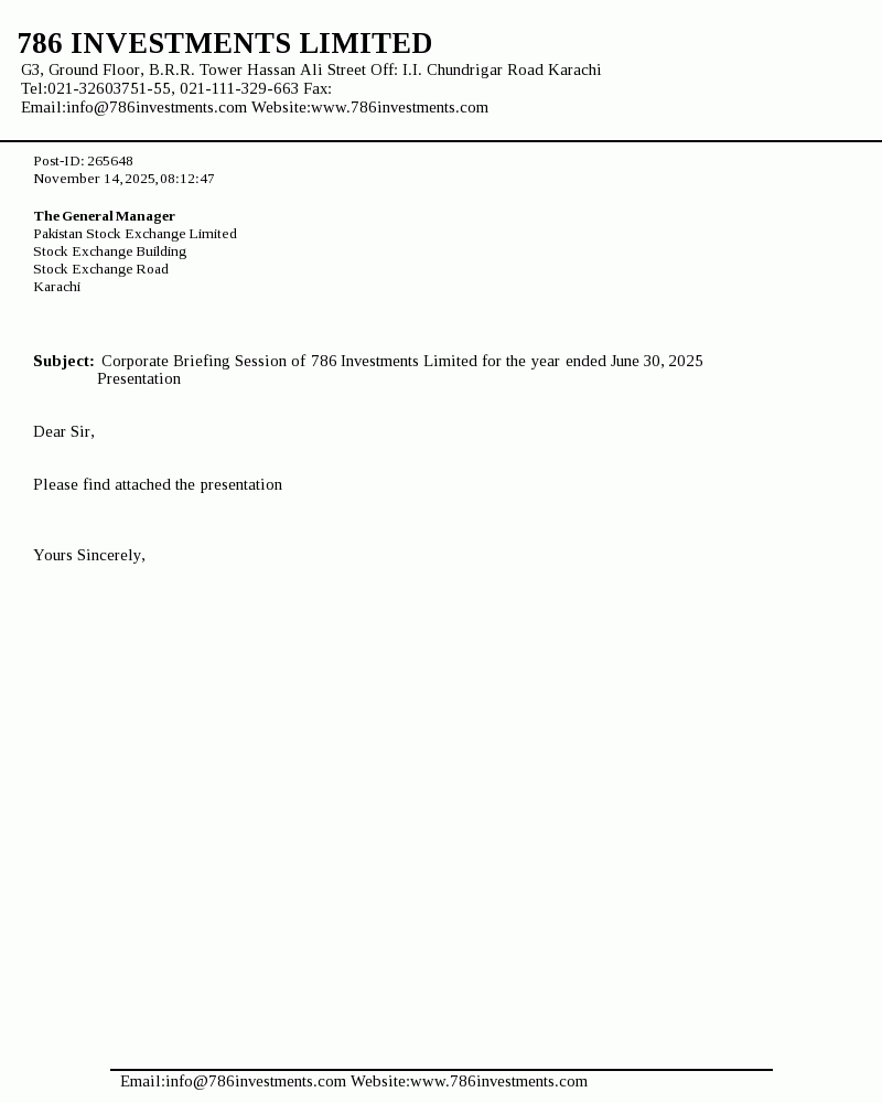 | 2025-11-14 | Corporate Briefing Session of 786 Investments Limited for the year ended June 30, 2025 Presentation | Image PDF |