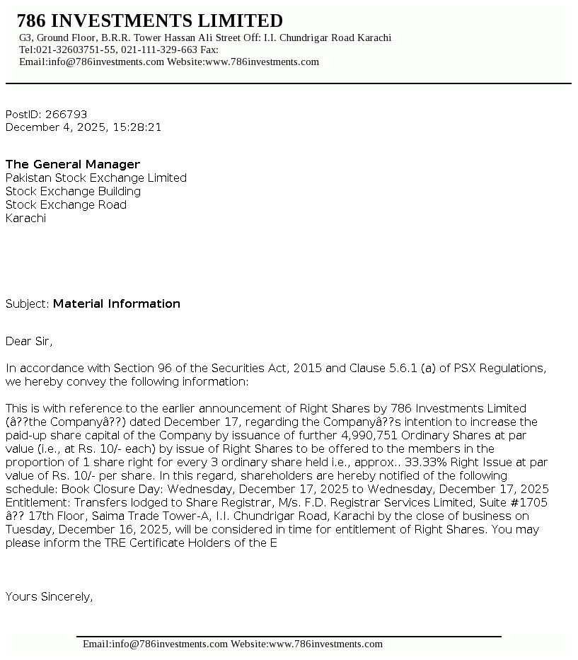 | 2025-12-15 | 786 | 786 Investments Limited 33.33% Right Issue at Par Value Rs.10/- Per Ordinary Shares | |