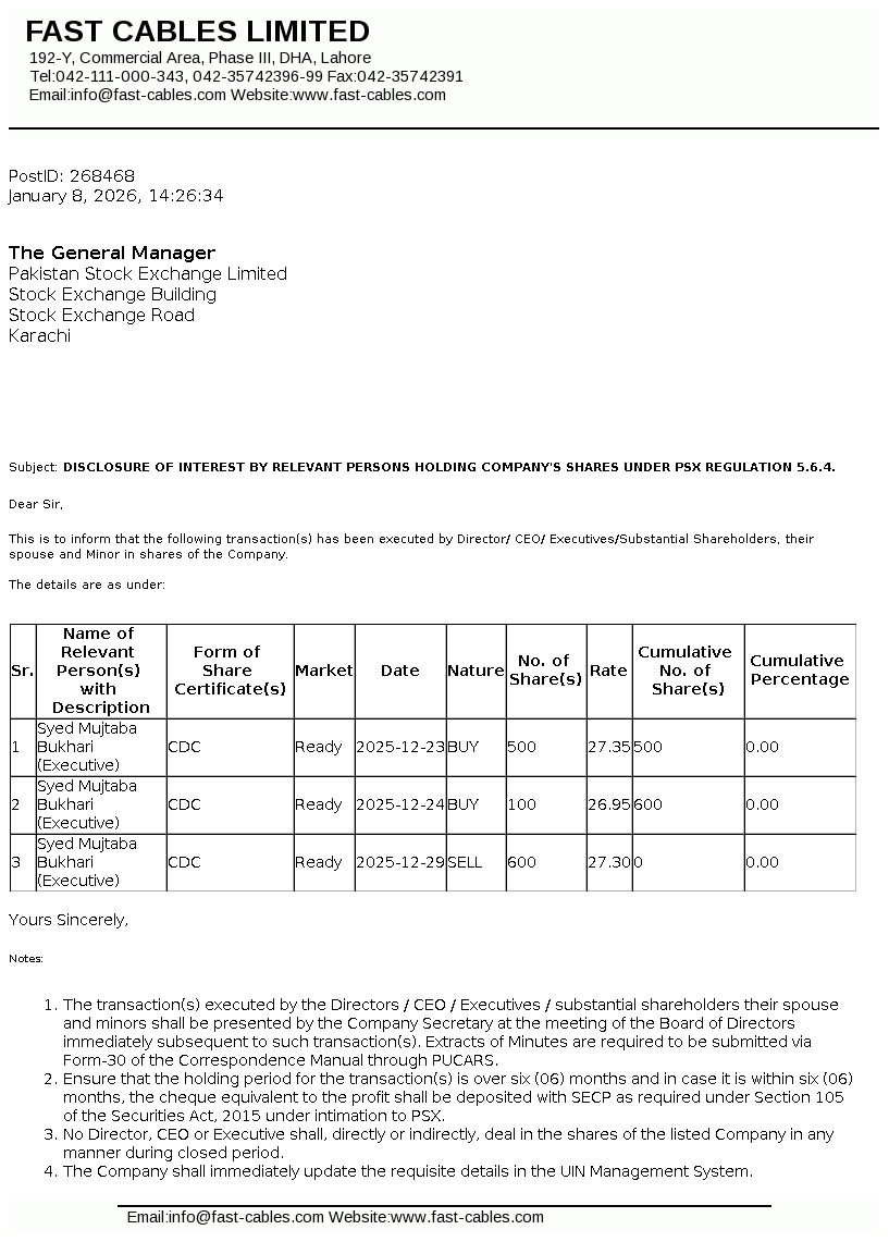 | 2026-01-08 | Syed Mujtaba Bukhari | Executive | Sell | 600 | 27.30 | View |