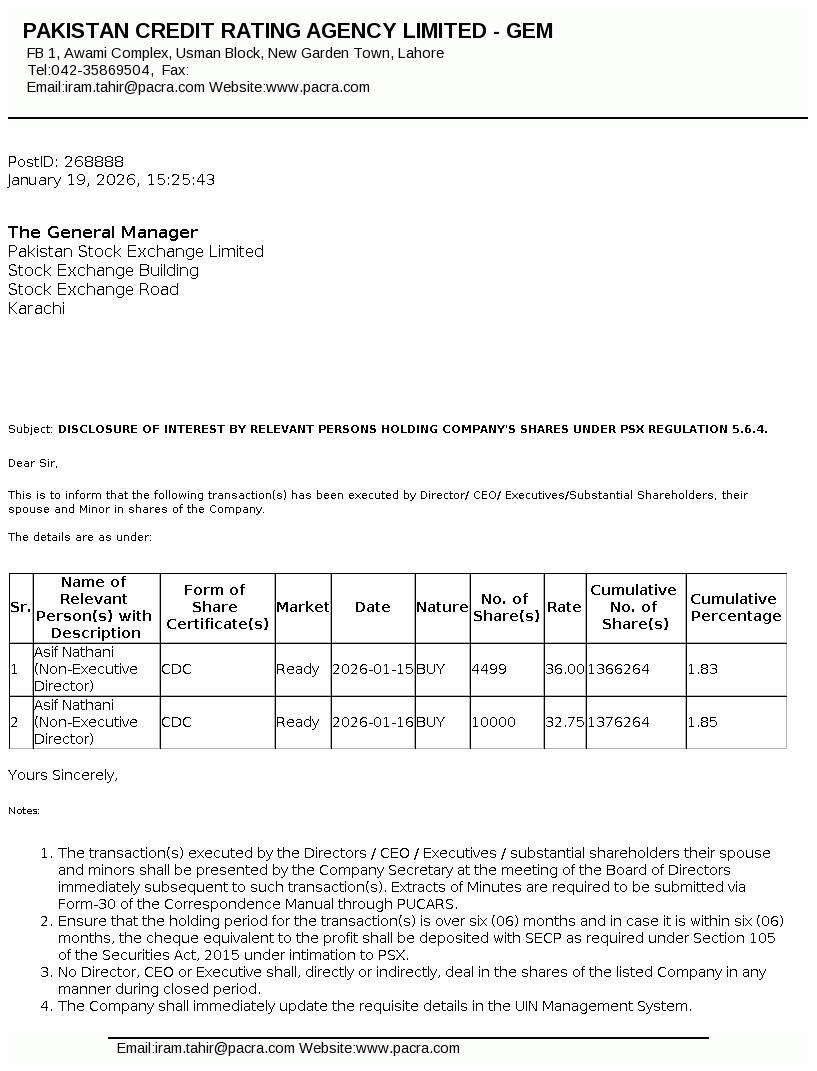 | 2026-03-18 | Mr. Abbas Sarfaraz Khan | Non-Executive Director | Buy | 5,000 | 60.00 | View |