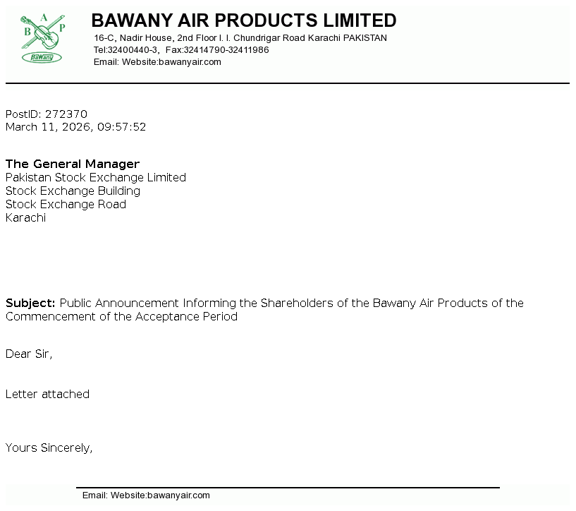 | 2026-03-11 | Public Announcement Informing the Shareholders of the Bawany Air Products of the Commencement of the Acceptance Period | Image PDF |