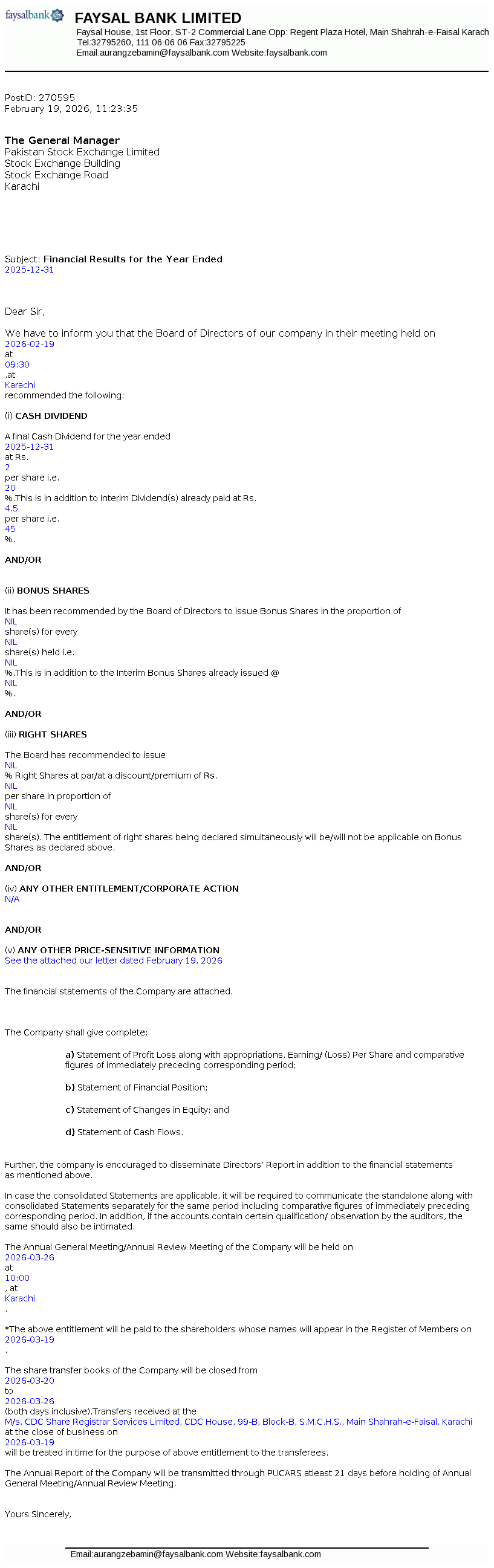 | 2026-02-19 | Financial Results for the year ended December 31, 2025 of Faysal Bank Limited | Image PDF |