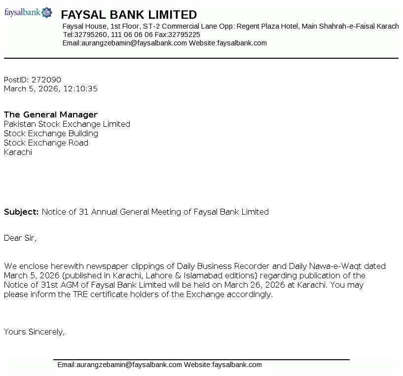 | 2026-03-04 | Notice of 31st Annual General Meeting of Faysal Bank Limited | Image PDF |