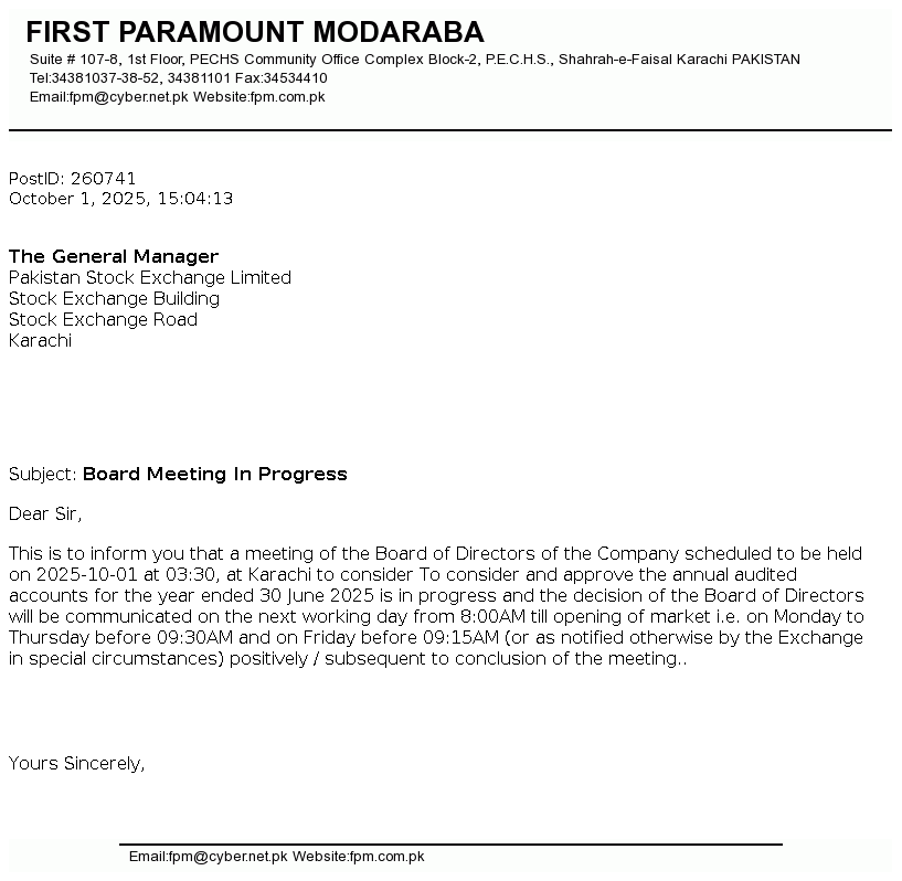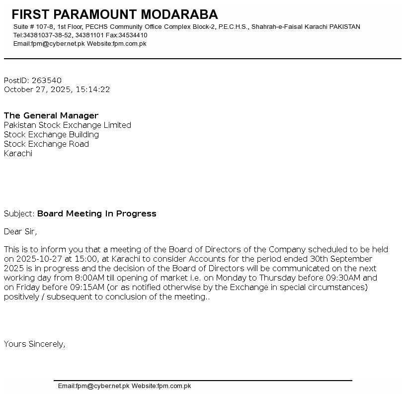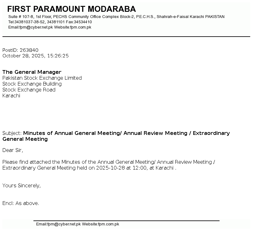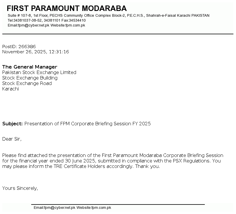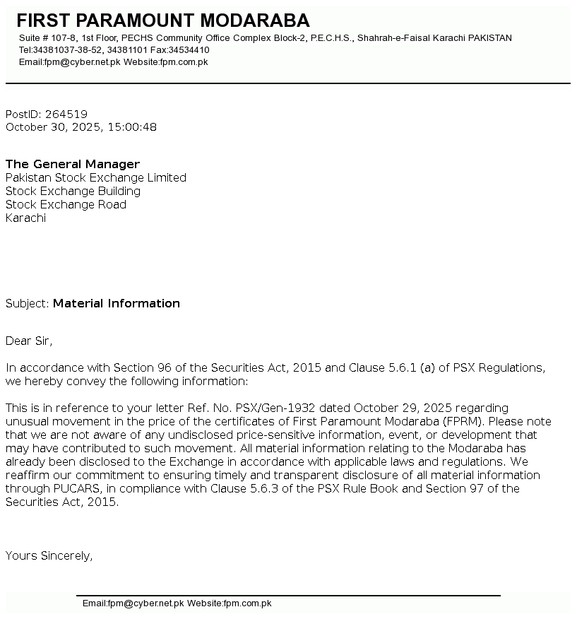 | 2025-10-30 | Unusual movement in price of the certificates of First Paramount Modaraba | Image PDF |