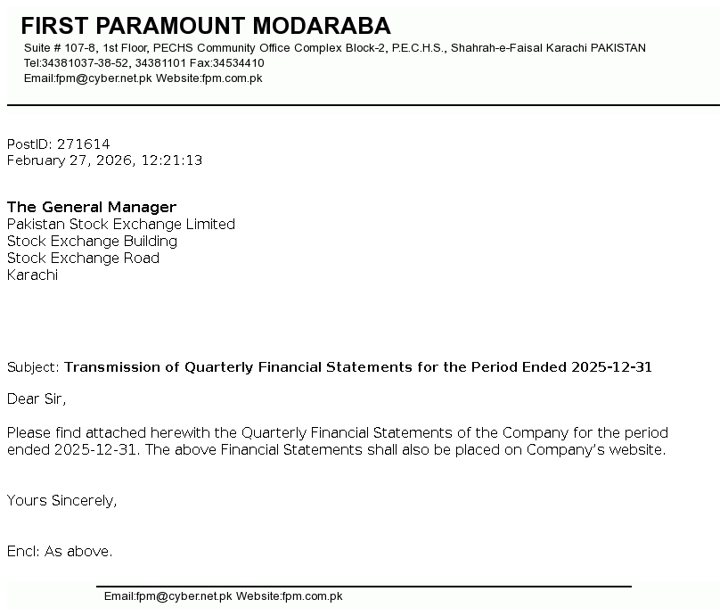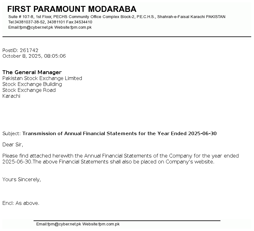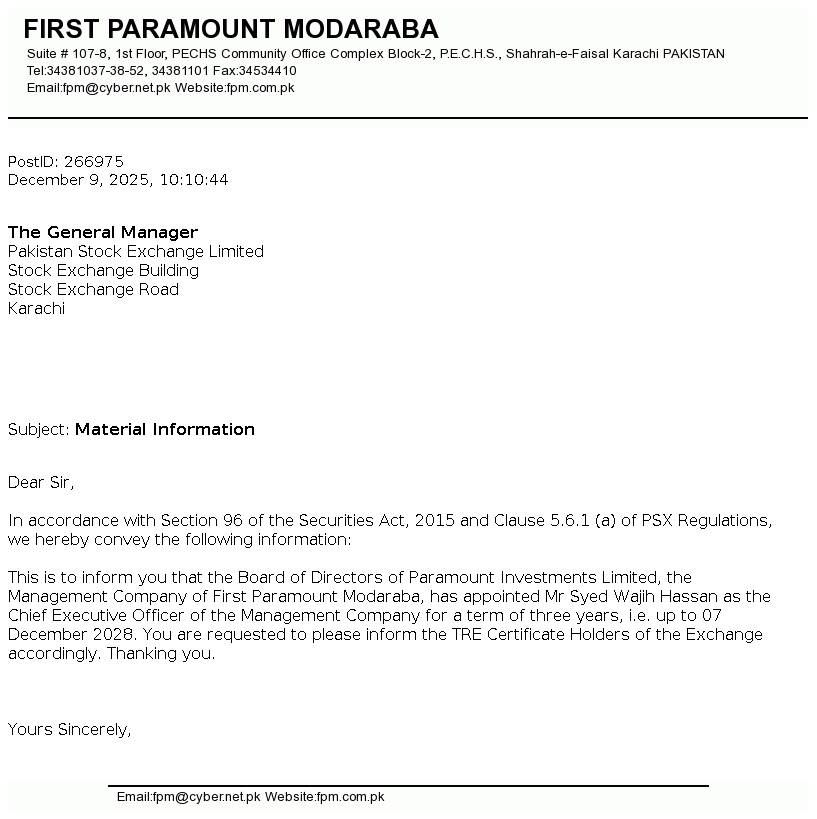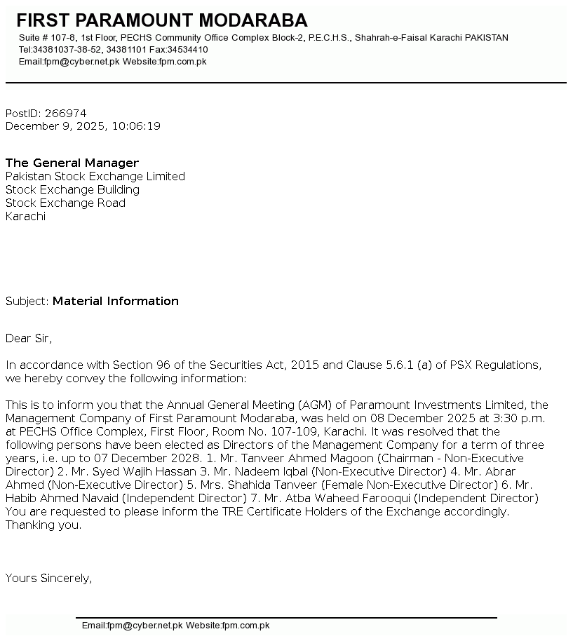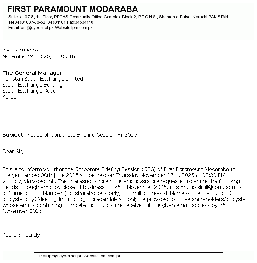 | 2025-10-30 | Unusual movement in price of the certificates of First Paramount Modaraba | Image PDF |