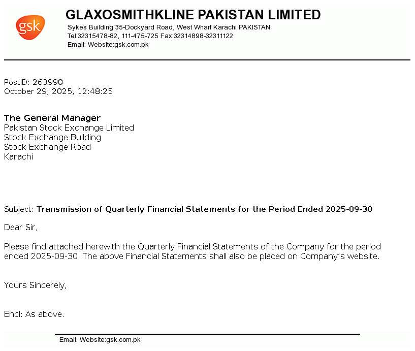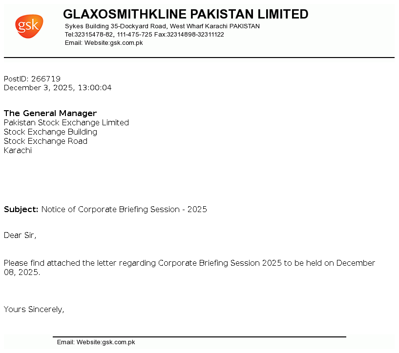 GlaxoSmithKline Pakistan Limited is incorporated in Pakistan as a limited liability company. It is engaged in manufacturing and marketing of research based ethical specialties and pharmaceutical products. The Company is a subsidiary of S.R. One International B.V., incorporated in Netherlands, whereas its ultimate parent company is GlaxoSmithKline plc, UK (GSK plc).