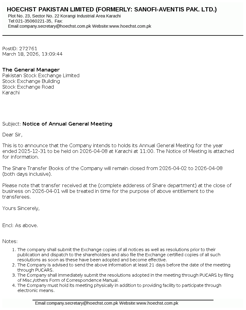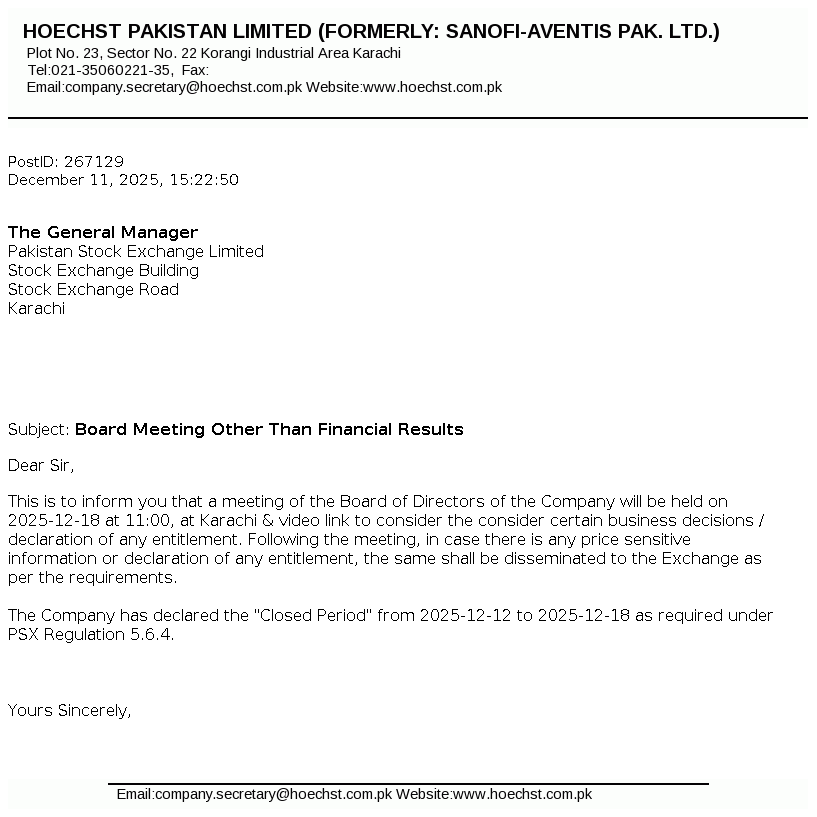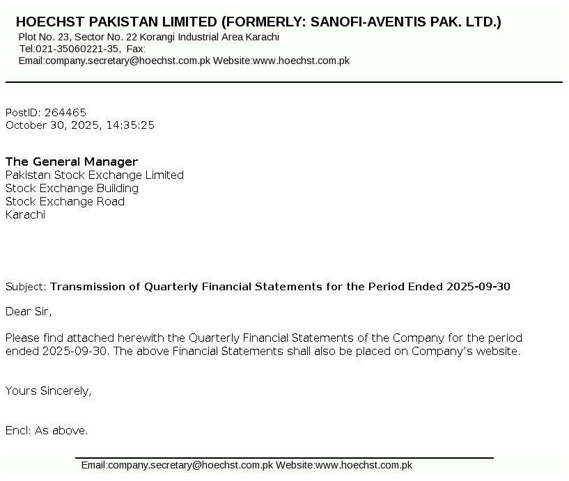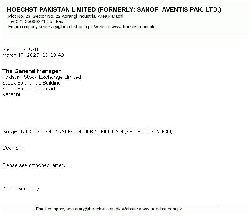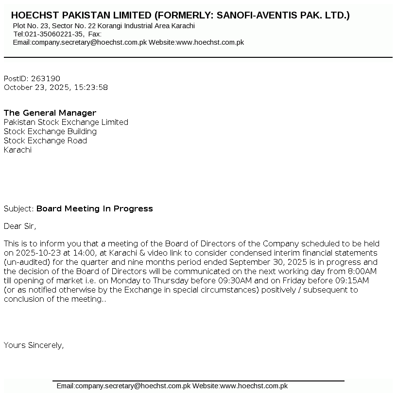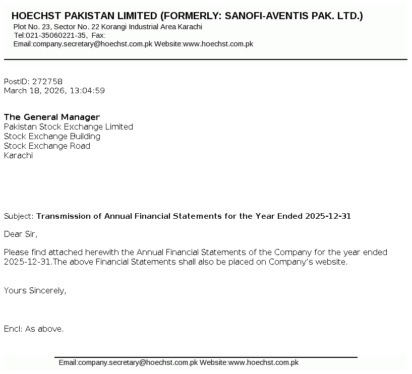 Hoechst Pakistan Limited is a public limited Company incorporated in Pakistan under the repealed Companies Act, 1913 (Now the Companies Act, 2017). The Company is engaged in the manufacturing, selling and trading of pharmaceutical and related products. The Company has changed its name from Sanofi-Aventis Pakistan Limited to Hoechst Pakistan Limited.