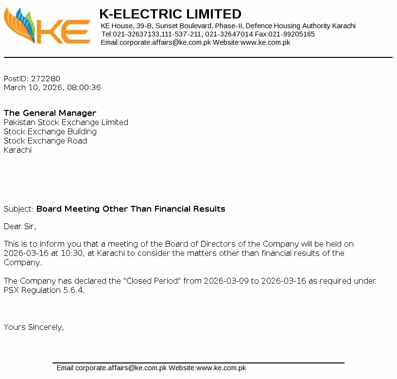 | 2026-03-17 | KEL | K-Electric Limited Meeting in Progress | |