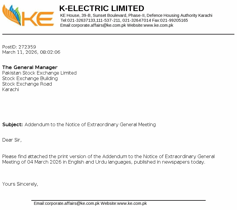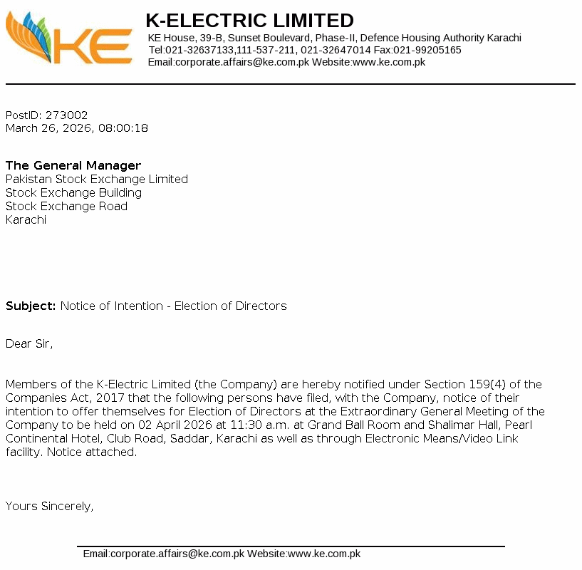 | 2026-02-13 | KEL | K-Electric Limited Resignation of Director | |
