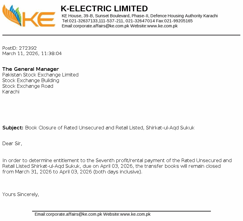 | 2026-04-07 | Book Closure of KE SUKUK-5. | Image PDF |