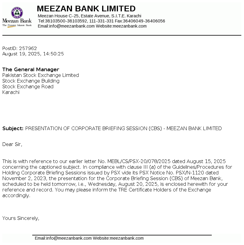 | 2025-08-19 | PRESENTATION OF CORPORATE BRIEFING SESSION (CBS) - MEEZAN BANK LIMITED | Image PDF |