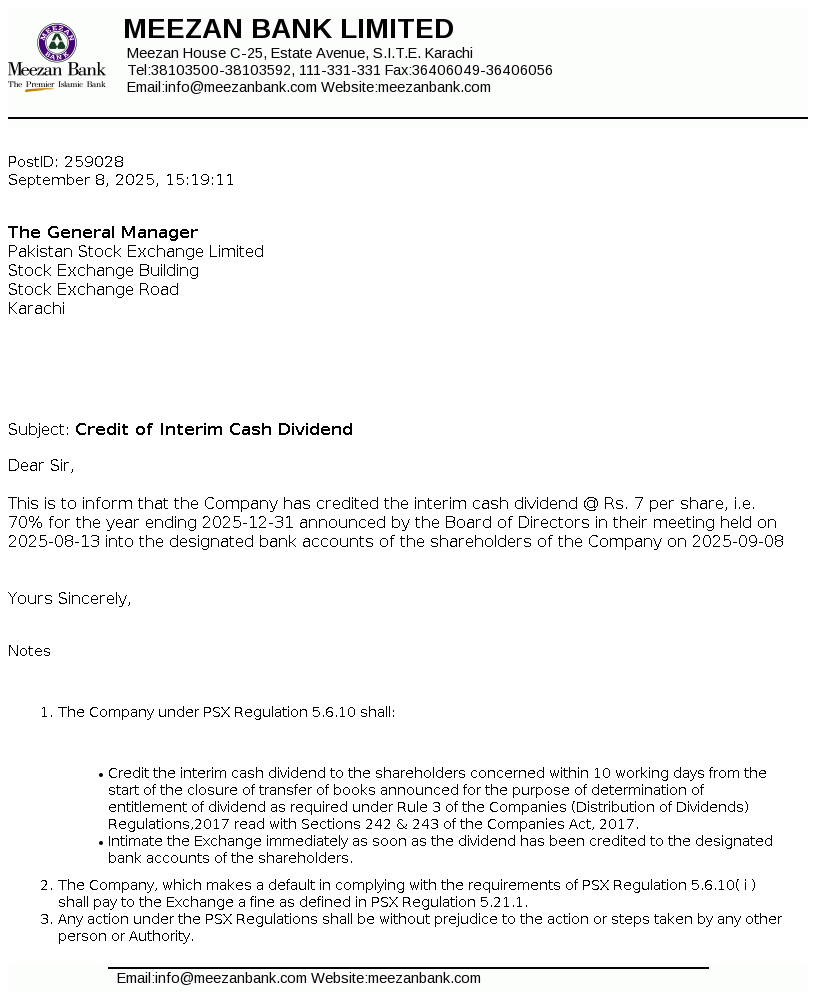 | 2025-09-08 | CREDIT OF INTERIM CASH DIVIDEND OF MEEZAN BANK LIMITED | Image PDF |
