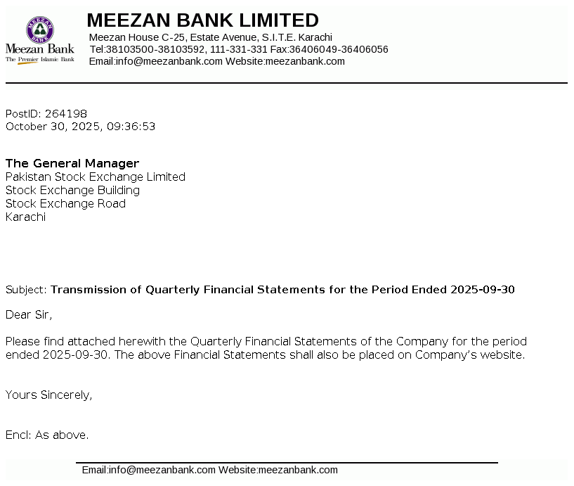 | 2025-10-30 | TRANSMISSION OF QUARTERLY REPORT OF MEEZAN BANK LIMITED FOR THE PERIOD ENDED SEPTEMBER 30, 2025 | Image PDF |