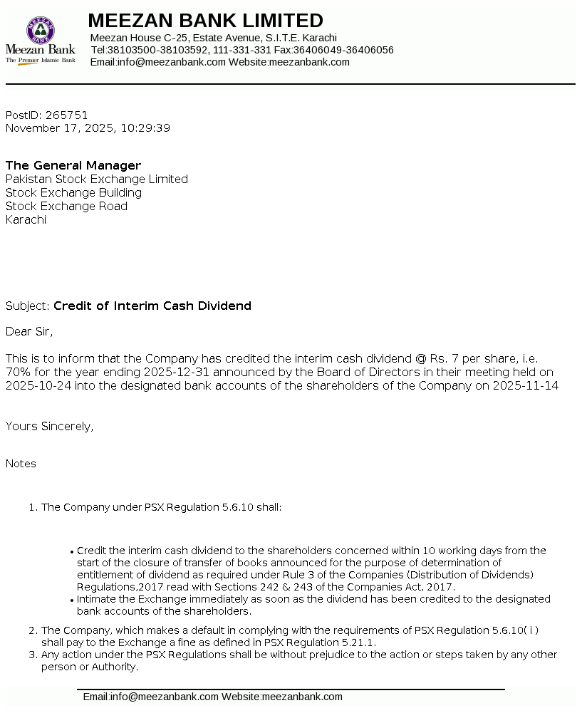| 2025-11-17 | CREDIT OF INTERIM CASH DIVIDEND OF MEEZAN BANK LIMITED | Image PDF |