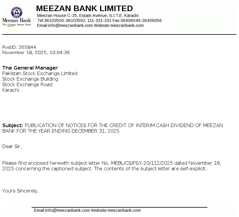 | 2025-11-18 | PUBLICATION OF NOTICES FOR THE CREDIT OF INTERIM CASH DIVIDEND OF MEEZAN BANK FOR THE YEAR ENDING DECEMBER 31, 2025 | Image PDF |