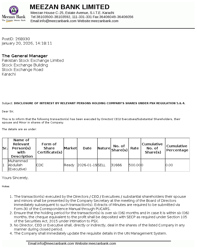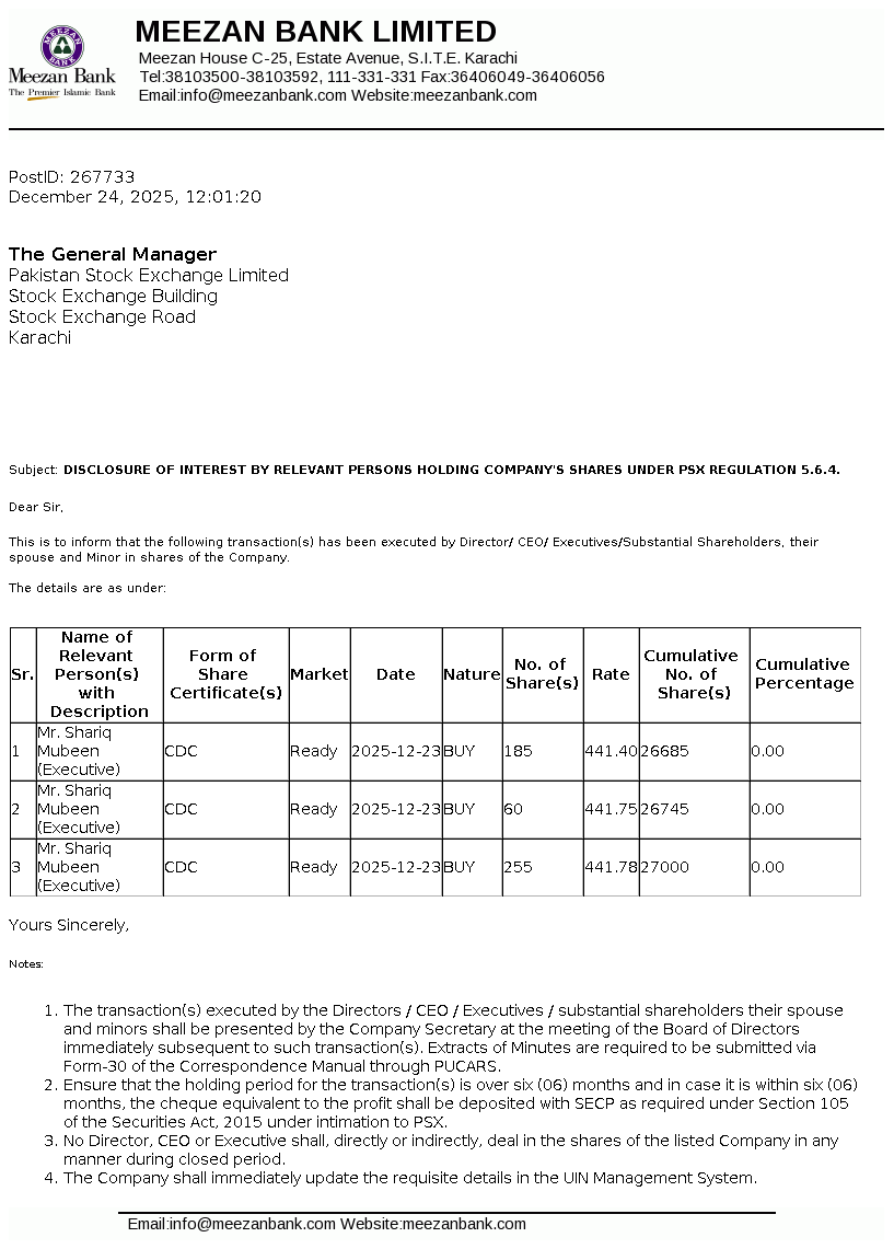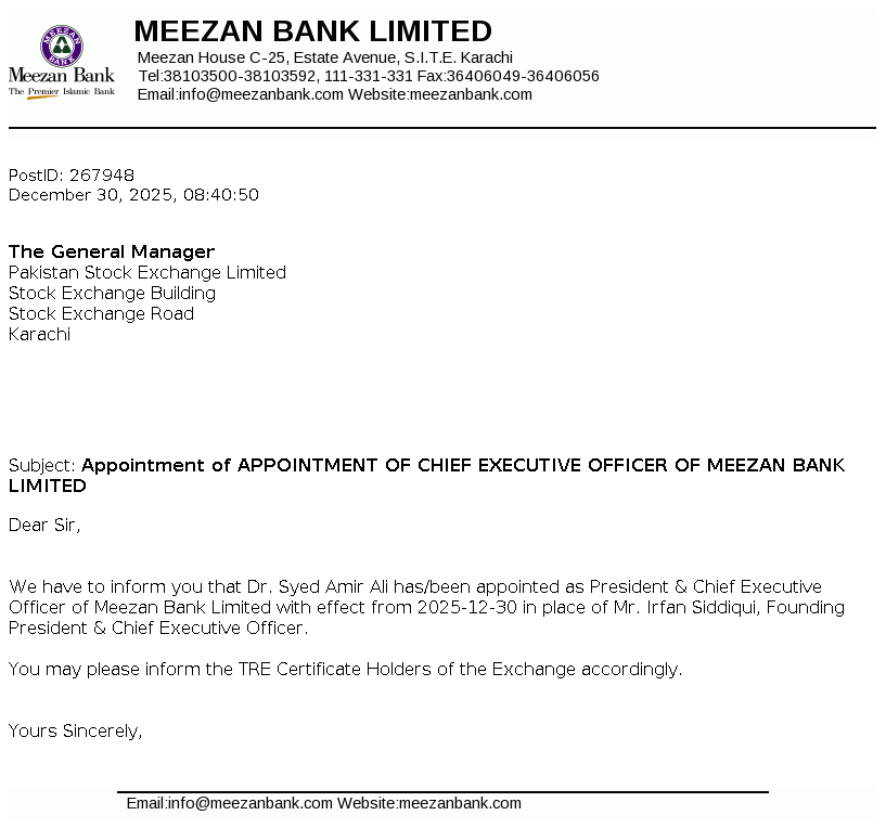 | 2025-12-30 | APPOINTMENT OF CHIEF EXECUTIVE OFFICER OF MEEZAN BANK LIMITED | Image PDF |