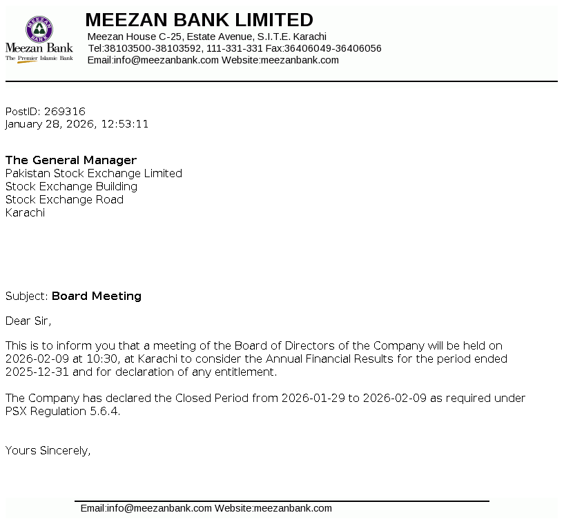 | 2025-10-15 | NOTICE OF BOARD MEETING AND CLOSED PERIOD - MEEZAN BANK LIMITED | Image PDF |