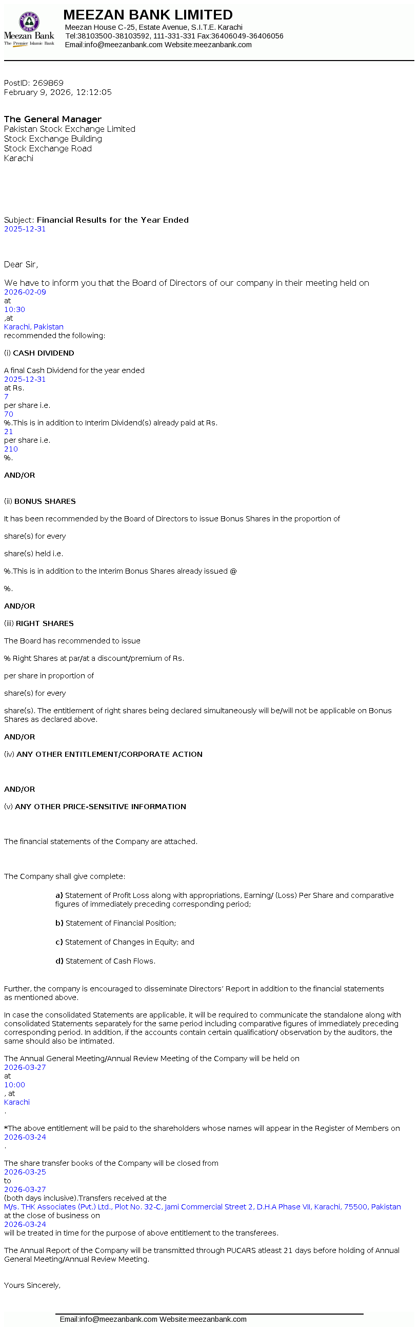 | 2025-10-28 | NOTICES OF BOOK CLOSURE FOR THE ENTITLEMENT OF 70% INTERIM CASH DIVIDEND FOR SHAREHOLDERS OF MEEZAN BANK | Image PDF |