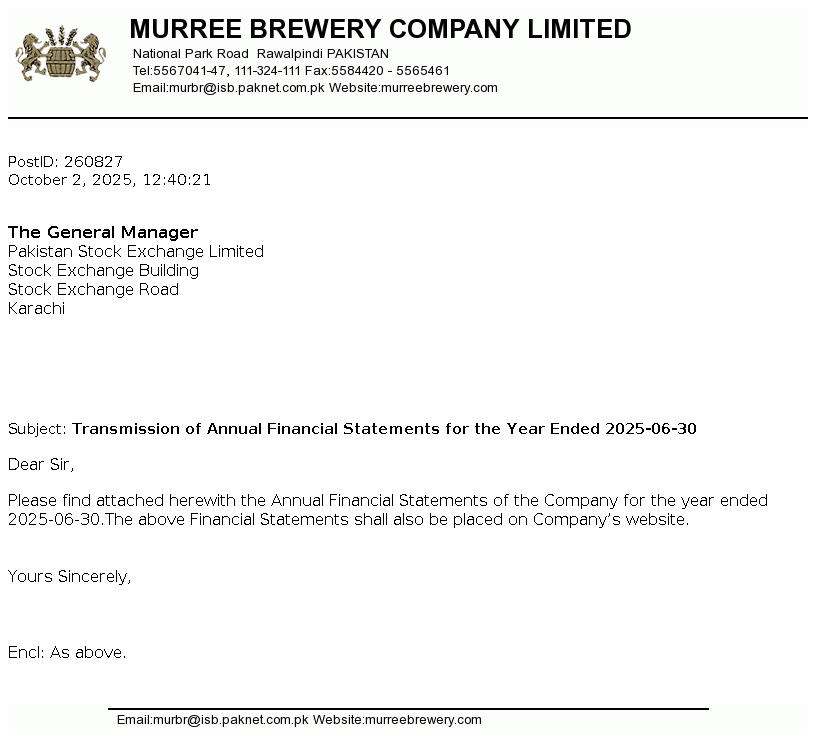 Murree Brewery Company Limited was incorporated under the repealed Indian Companies Act (now the Companies Act, 2017) in February 1861 as a public limited company in Pakistan. The Company is principally engaged in the manufacturing of alcoholic beer, Pakistan Made Foreign Liquor (PMFL), nonalcoholic beer, aerated water (non-alcoholic products), juices and food products, mineral water, glass bottles and jars. The Company is presently operating three divisions namely Liquor, Tops and Glass to carry out its principal activities.