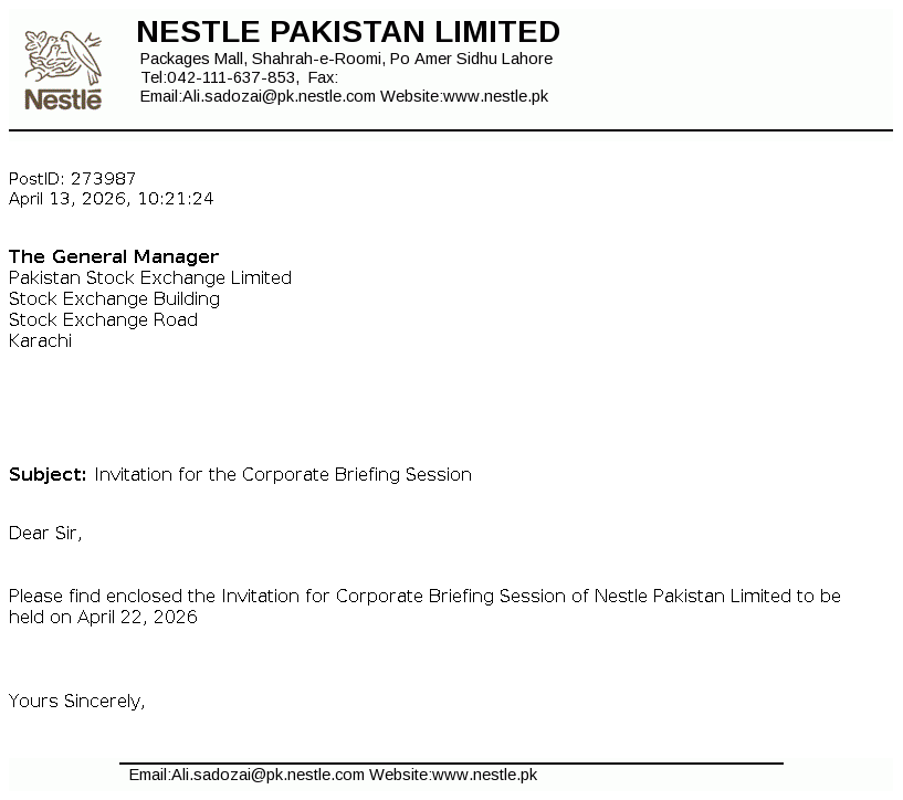 Nestlé Pakistan Limited is a public limited company incorporated in Pakistan - under the repealed Companies Ordinance 1984 (now Companies Act 2017). The Company is a subsidiary of Nestlé S.A, a Swiss based public limited company.The Company is principally engaged in manufacturing, processing and sale of dairy, nutrition, beverages and food products including imported products.