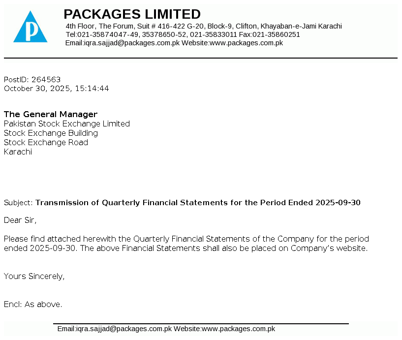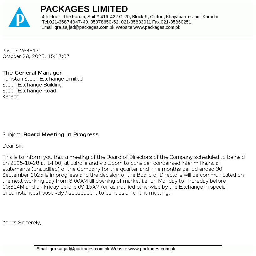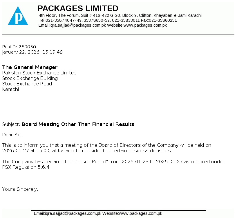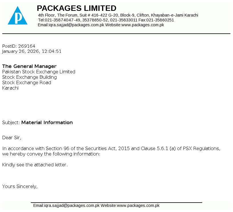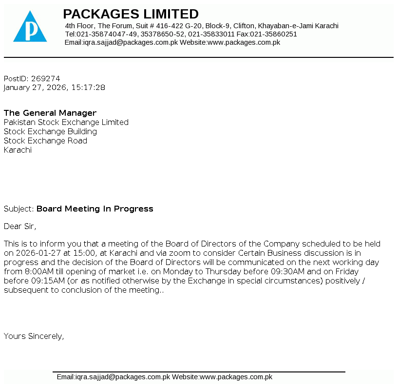 Packages Limited is a public limited company incorporated in Pakistan. It is principally engaged in the manufacture and sale of packaging materials and tissue products. The Company also holds investments in companies.
