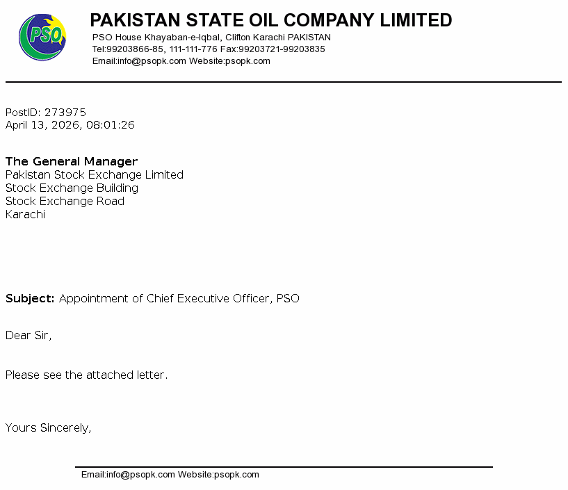 Pakistan State Oil Company Limited, PSO House, Khayaban-e-Iqbal, Clifton,Karachi - 75600, Pakistan