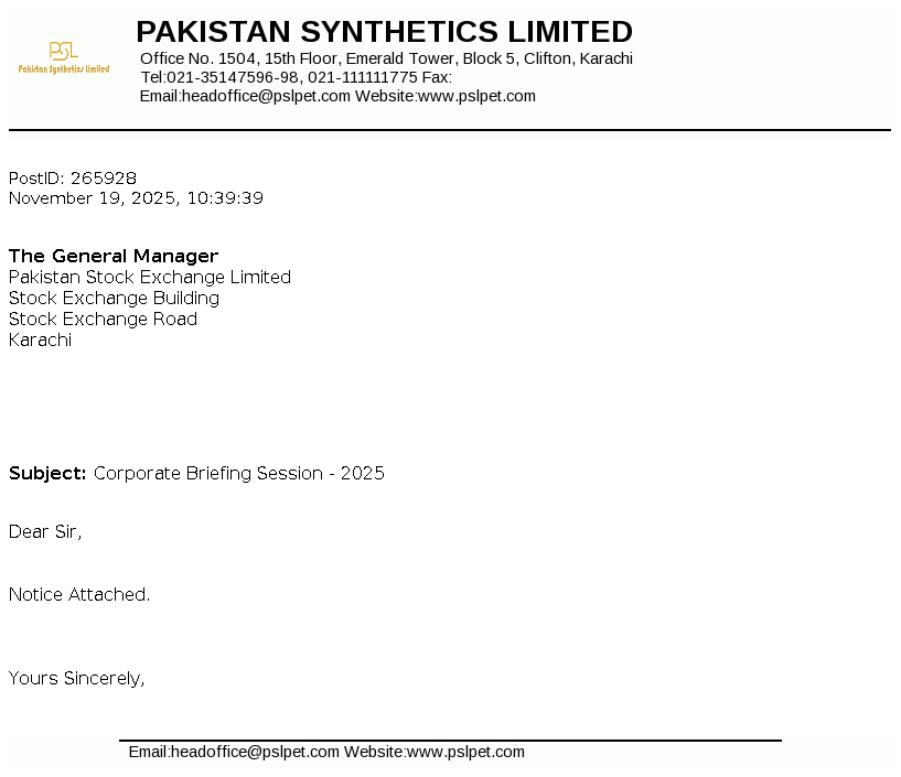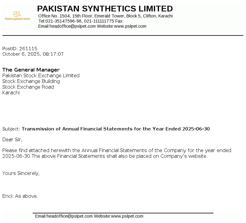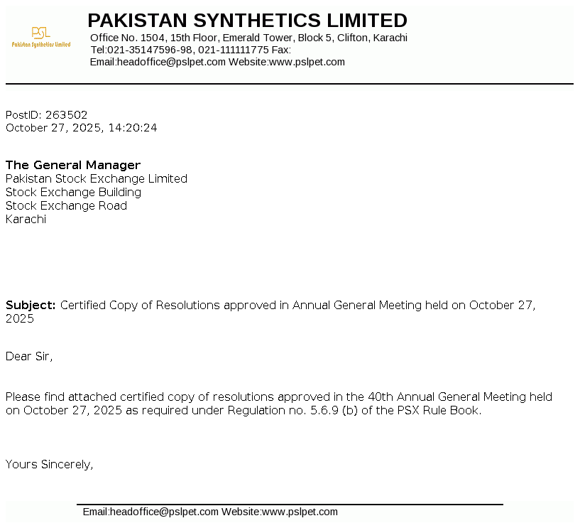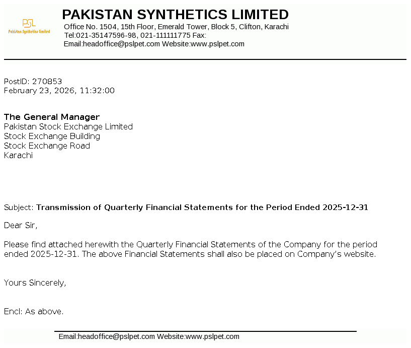 Pakistan Synthetics Limited was incorporated on 18 November 1984 as a private limited company in Pakistan and subsequently converted into a public limited company on 30 December 1987. The principal activity of the Company is manufacturing and sale of Plastic Caps, Crown Caps, PET Resin, Preform and BOPET Resin.