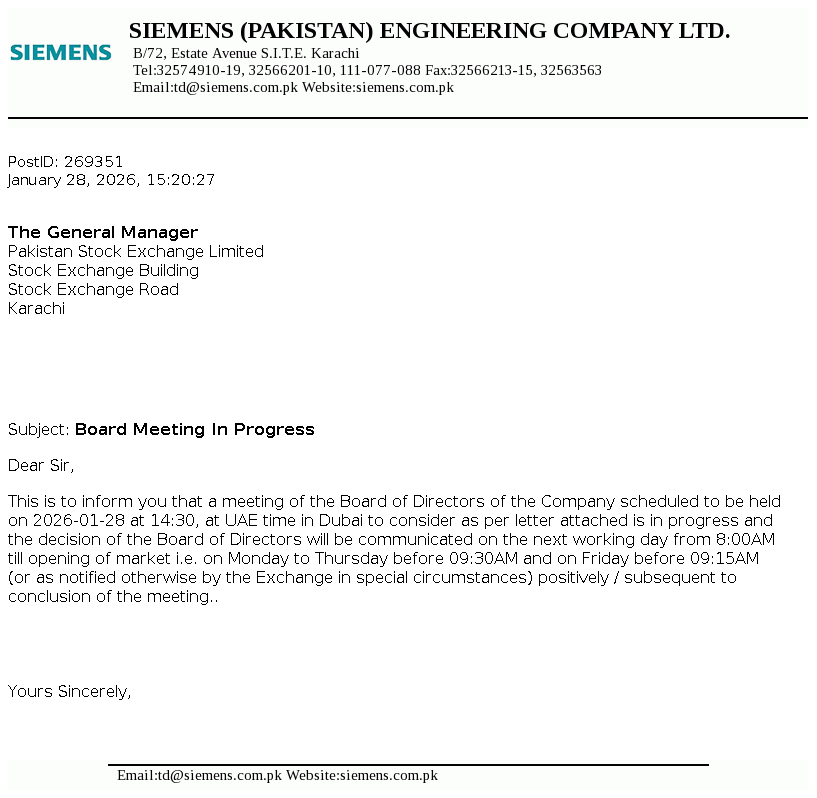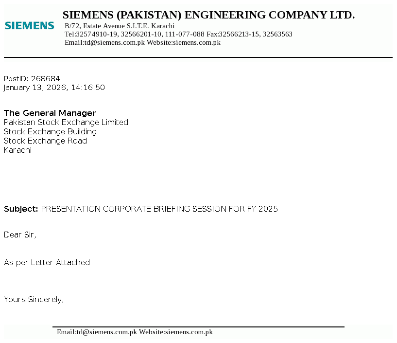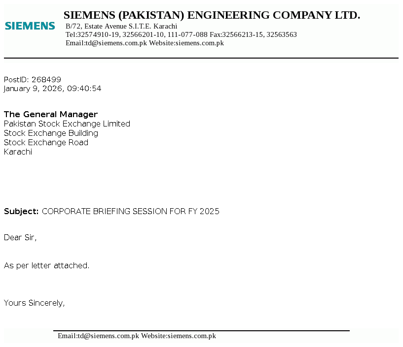 Siemens (Pakistan) Engineering Co.Ltd was incorporated in Pakistan in 1953 as a public limited company. The Company is principally engaged in execution of projects under contracts and in manufacturing, installation and sale of electronic and electrical capital goods.