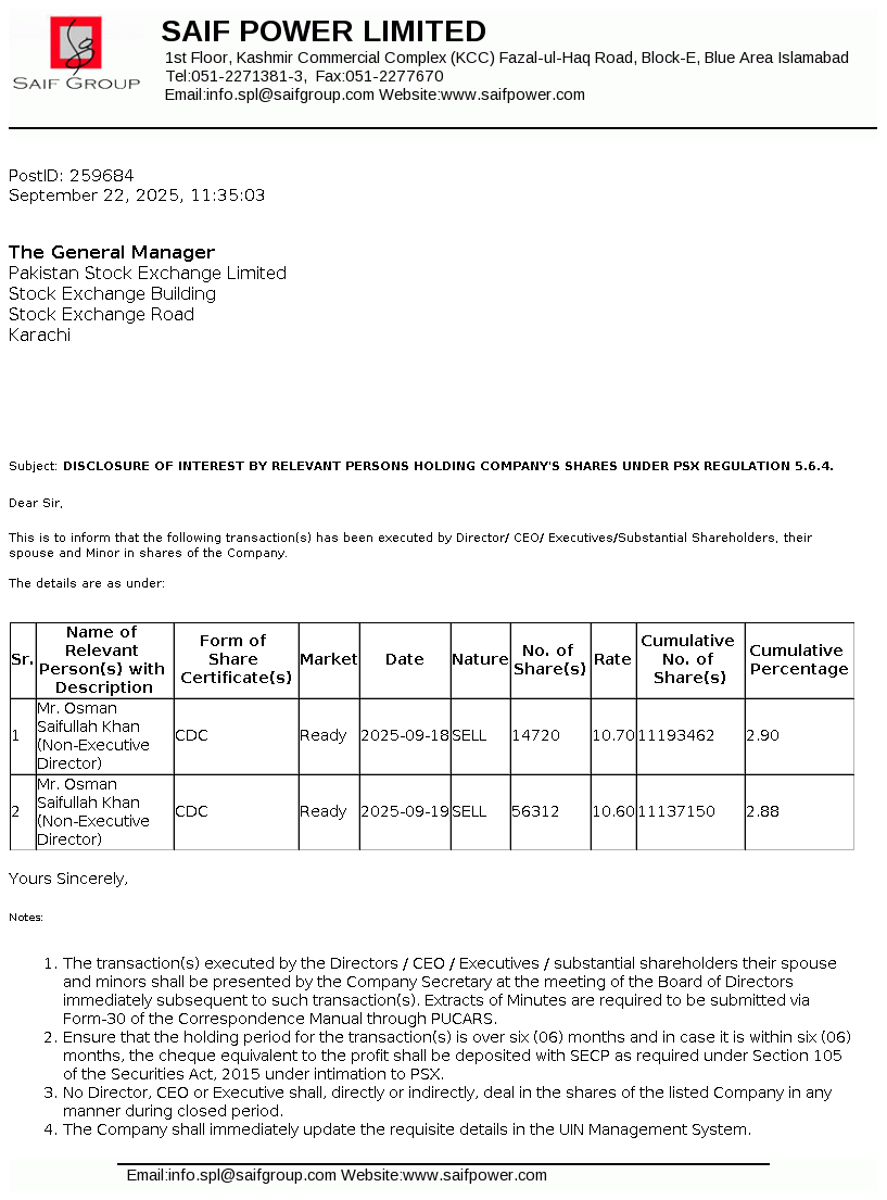 | 2025-09-22 | Disclosure of Interest by a Director CEO, or Executive of a listed company and their Spouses and the Substantial Shareholders u/c 5.6.1.(d) of PSX Regulations | Image |