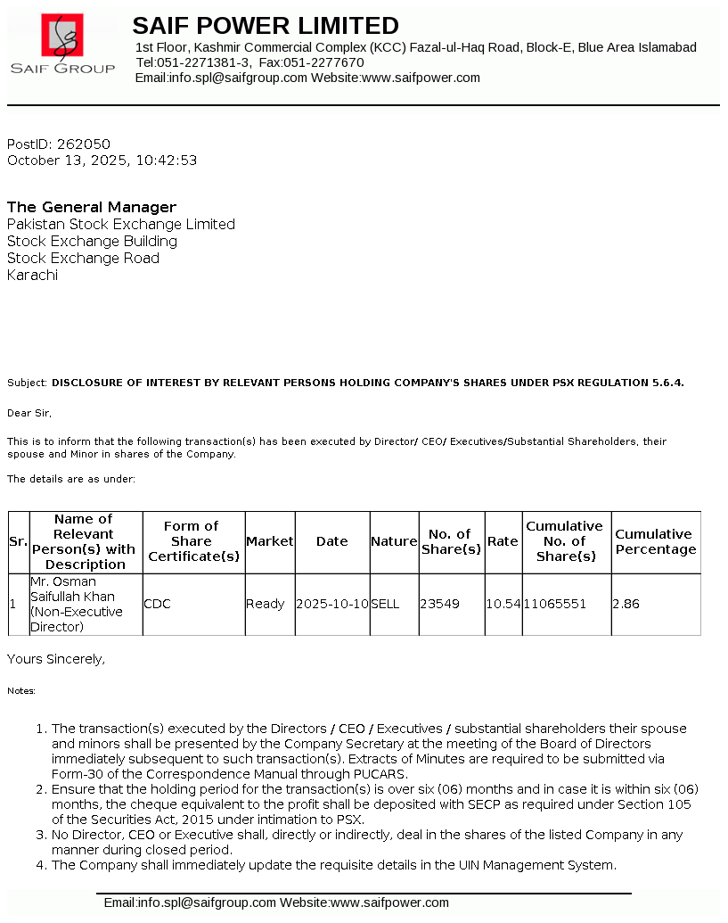 | 2025-10-13 | Disclosure of Interest by a Director CEO, or Executive of a listed company and their Spouses and the Substantial Shareholders u/c 5.6.1.(d) of PSX Regulations | Image |