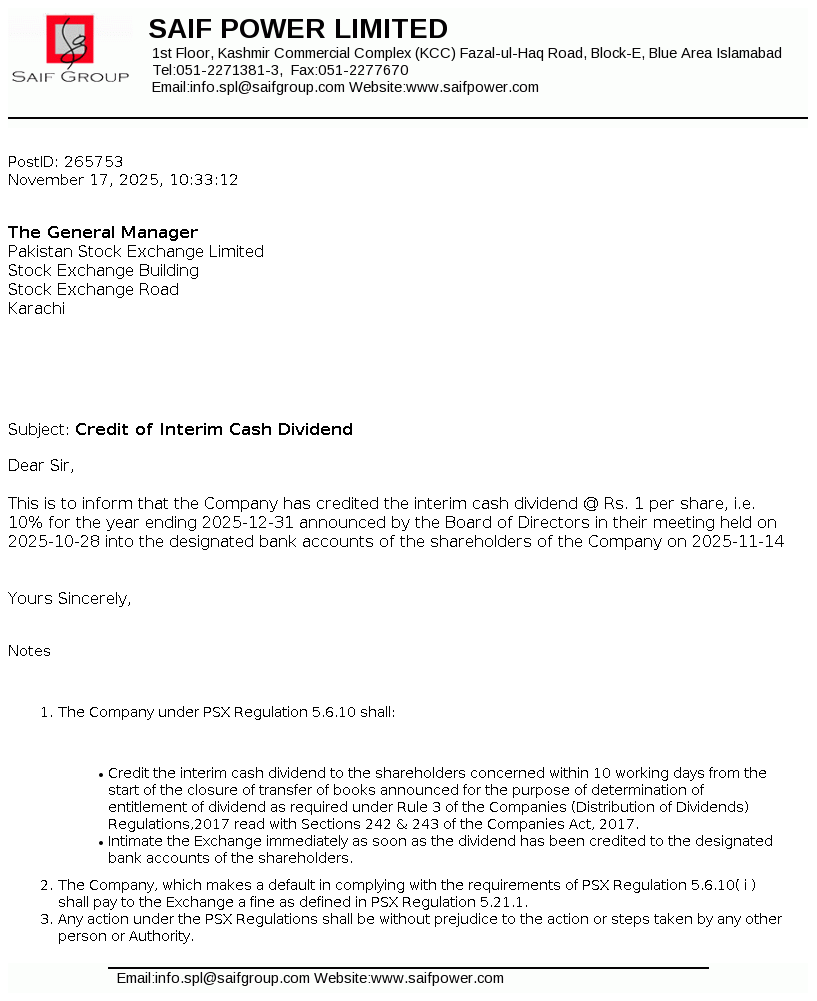 | 2025-11-12 | Disclosure of Interest by a Director CEO, or Executive of a listed company and their Spouses and the Substantial Shareholders u/c 5.6.1.(d) of PSX Regulations | Image |