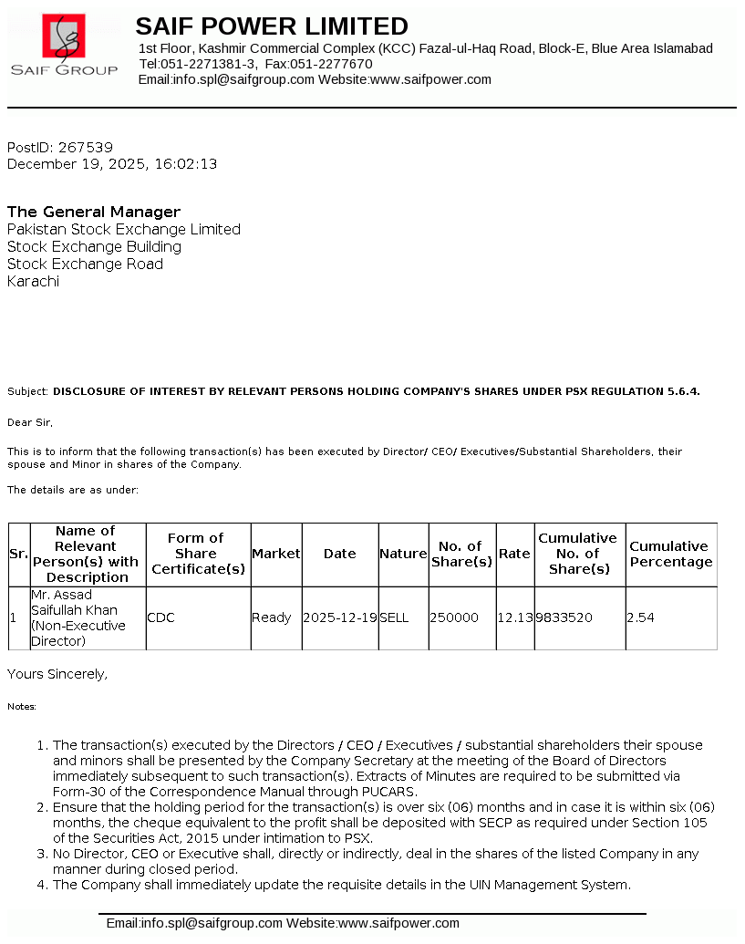| 2025-12-19 | Disclosure of Interest by a Director CEO, or Executive of a listed company and their Spouses and the Substantial Shareholders u/c 5.6.1.(d) of PSX Regulations | Image |