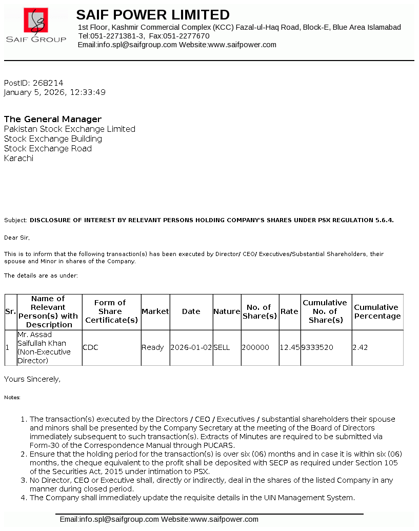 | 2026-01-15 | Disclosure of Interest by a Director CEO, or Executive of a listed company and their Spouses and the Substantial Shareholders u/c 5.6.1.(d) of PSX Regulations | Image |