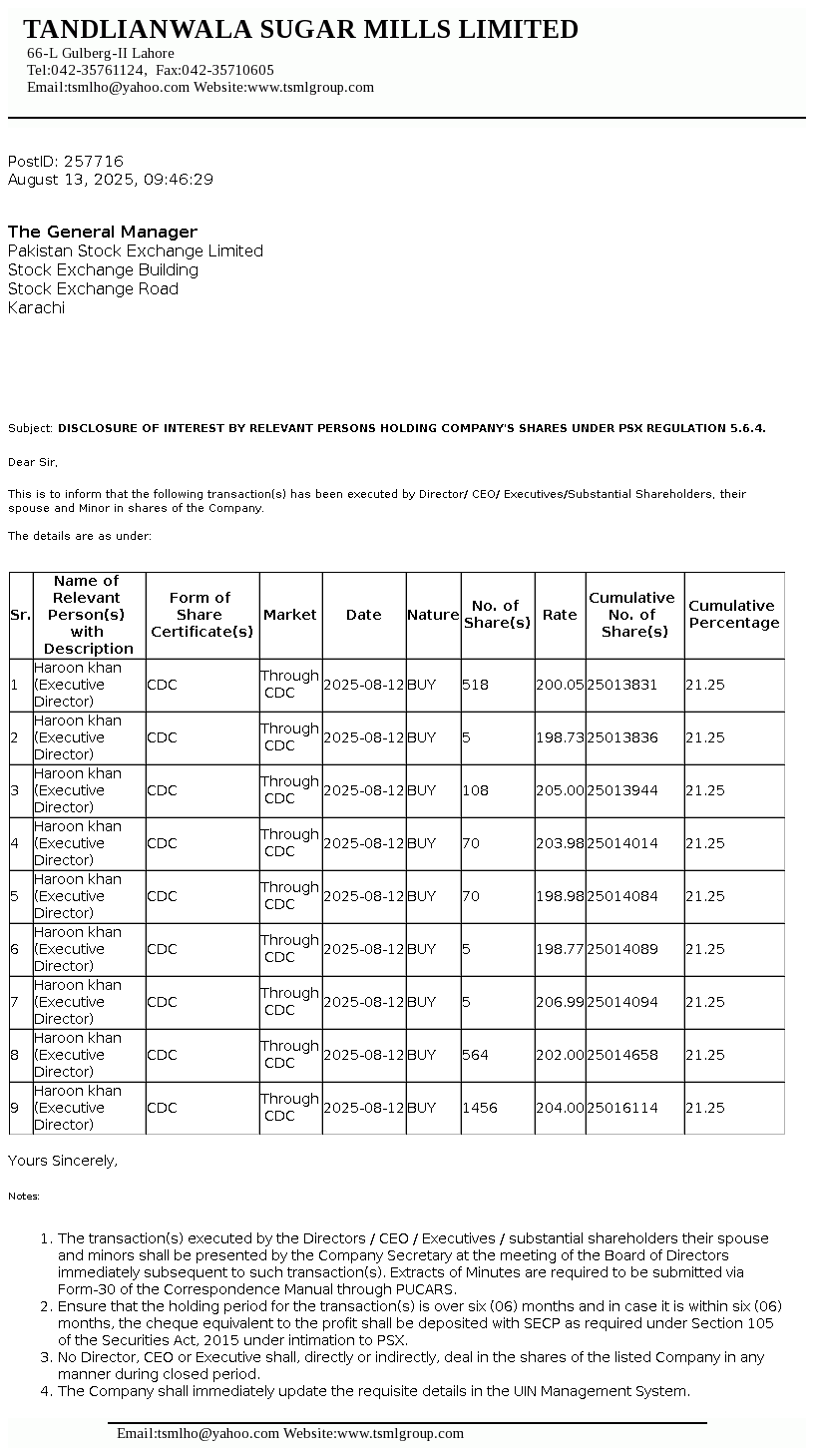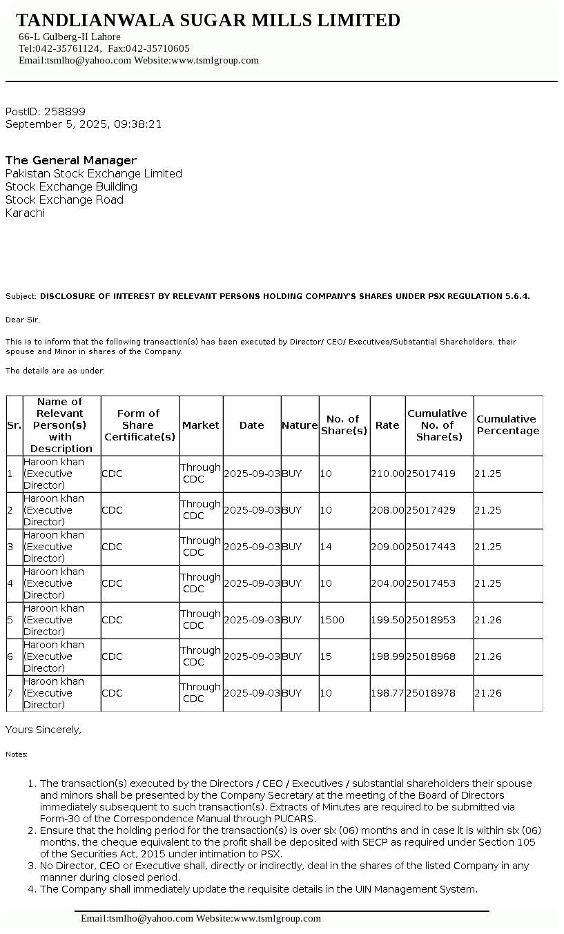 | 2025-09-26 | Disclosure of Interest by a Director CEO, or Executive of a listed company and their Spouses and the Substantial Shareholders u/c 5.6.1.(d) of PSX Regulations | Image PDF |