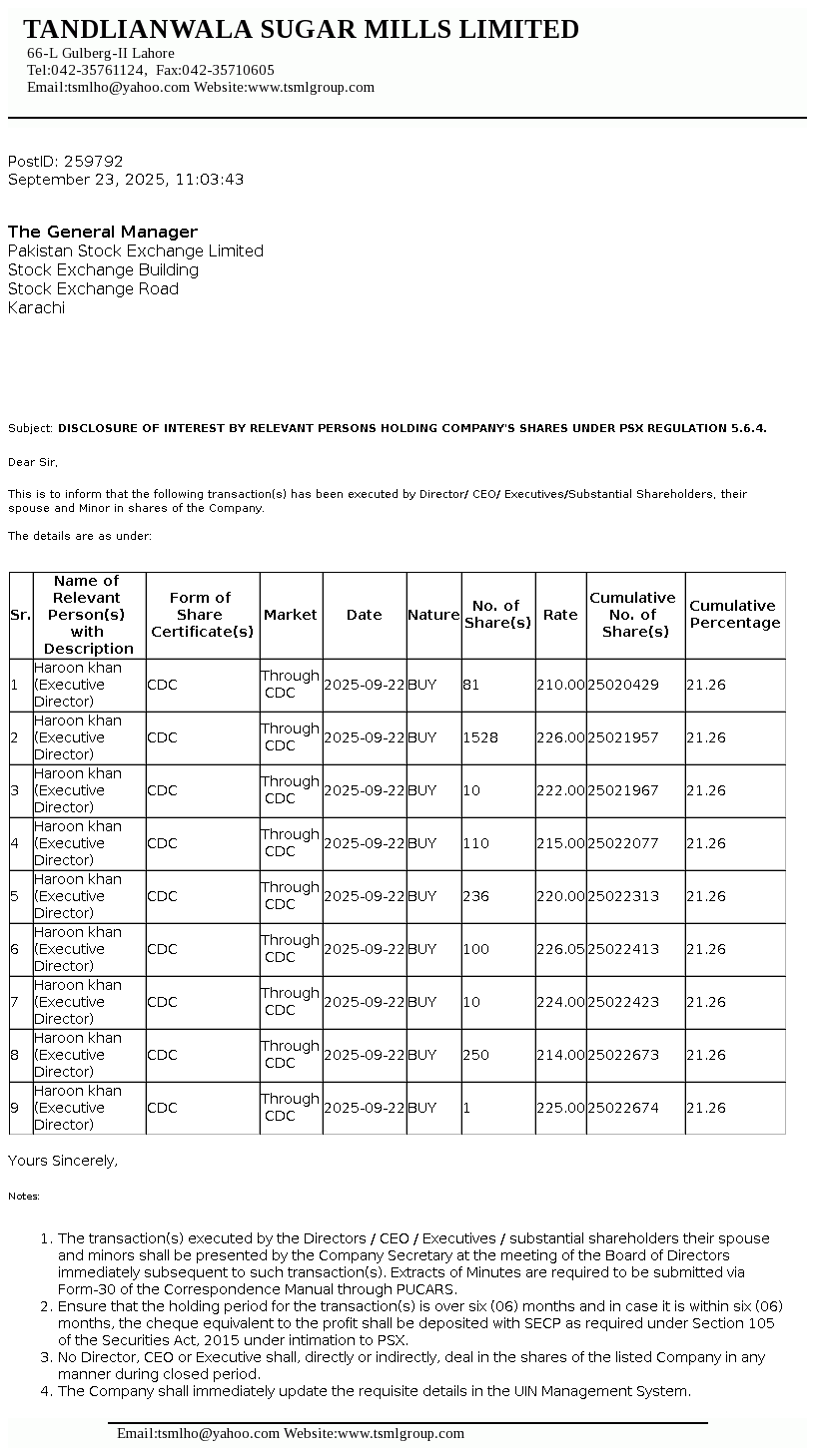 | 2025-09-23 | Disclosure of Interest by a Director CEO, or Executive of a listed company and their Spouses and the Substantial Shareholders u/c 5.6.1.(d) of PSX Regulations | Image PDF |