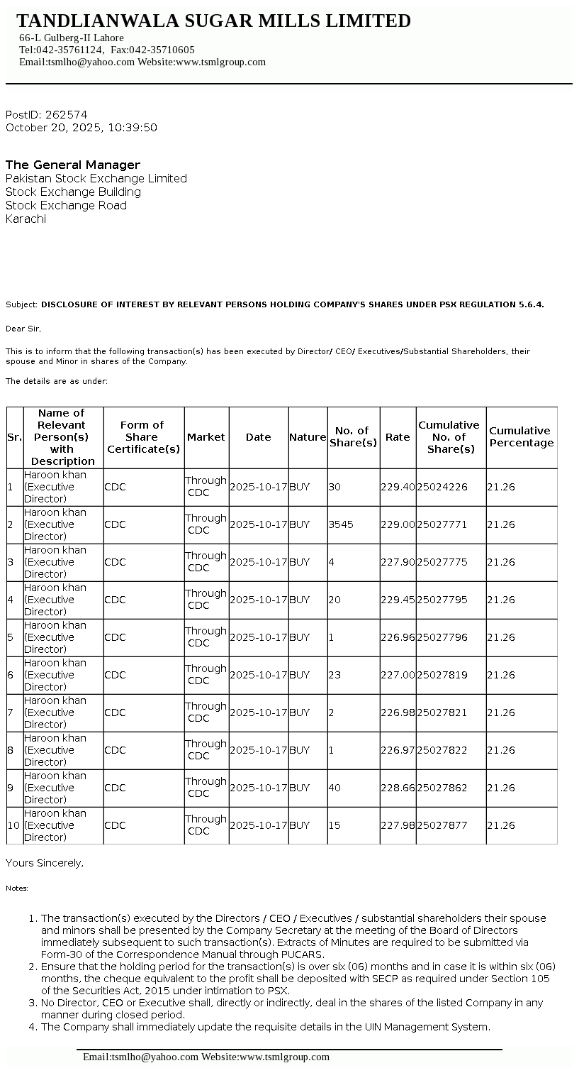 | 2025-10-20 | Disclosure of Interest by a Director CEO, or Executive of a listed company and their Spouses and the Substantial Shareholders u/c 5.6.1.(d) of PSX Regulations | Image PDF |