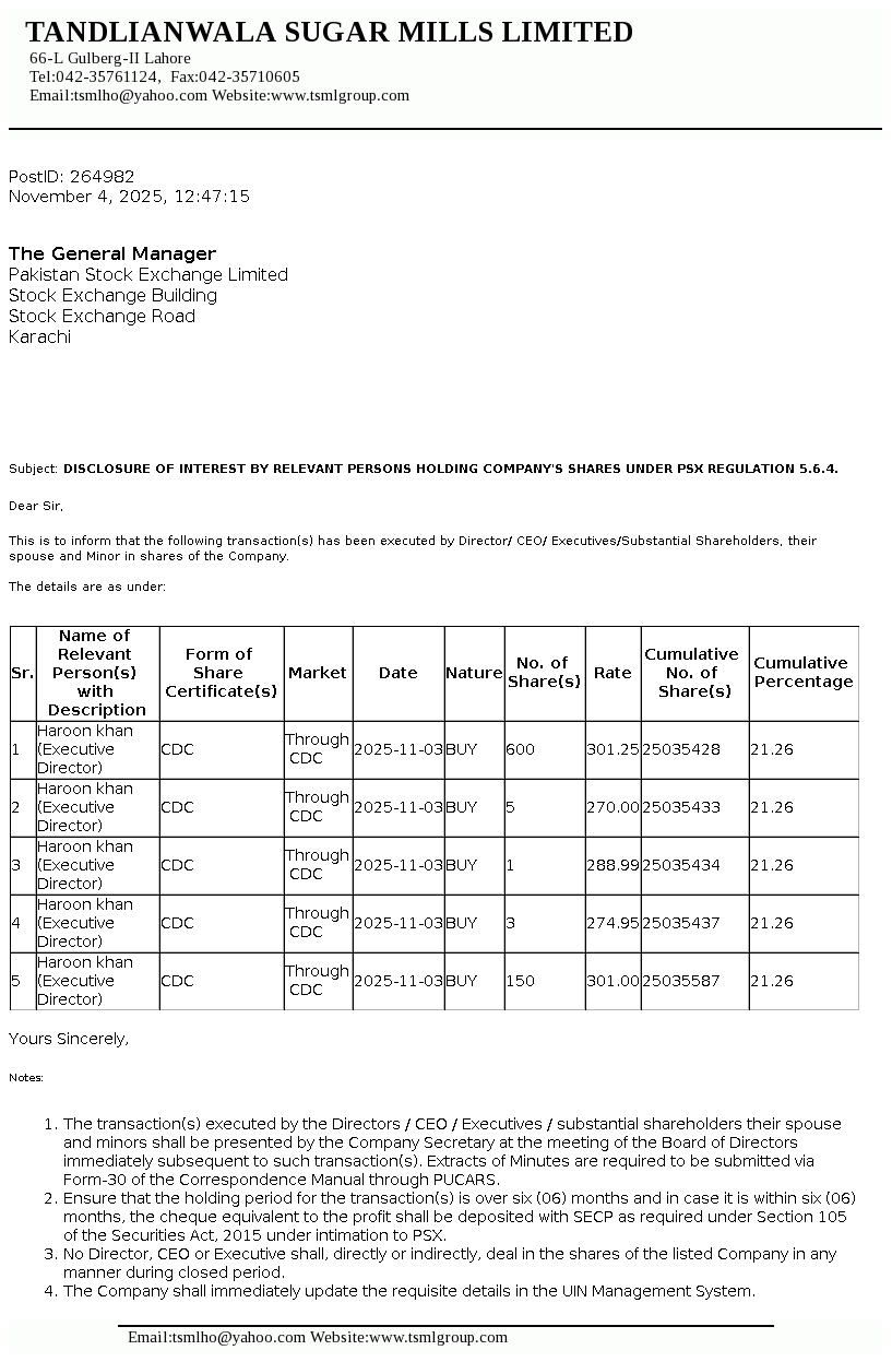 | 2025-11-04 | Disclosure of Interest by a Director CEO, or Executive of a listed company and their Spouses and the Substantial Shareholders u/c 5.6.1.(d) of PSX Regulations | Image PDF |
