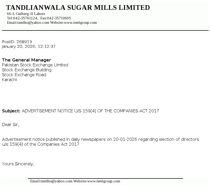 | 2026-01-20 | ADVERTISEMENT NOTICE U/S 159(4) OF THE COMPANIES ACT 2017 | Image PDF |
