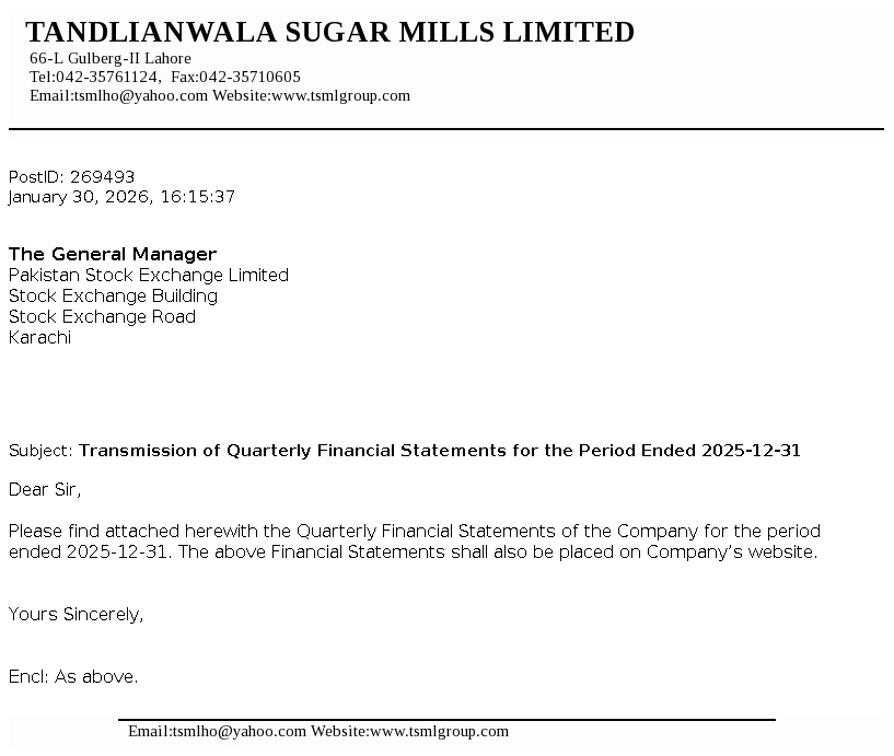 | 2026-01-30 | Transmission of Quarterly Financial Statements for the Period Ended December 31, 2025. | Image PDF |
