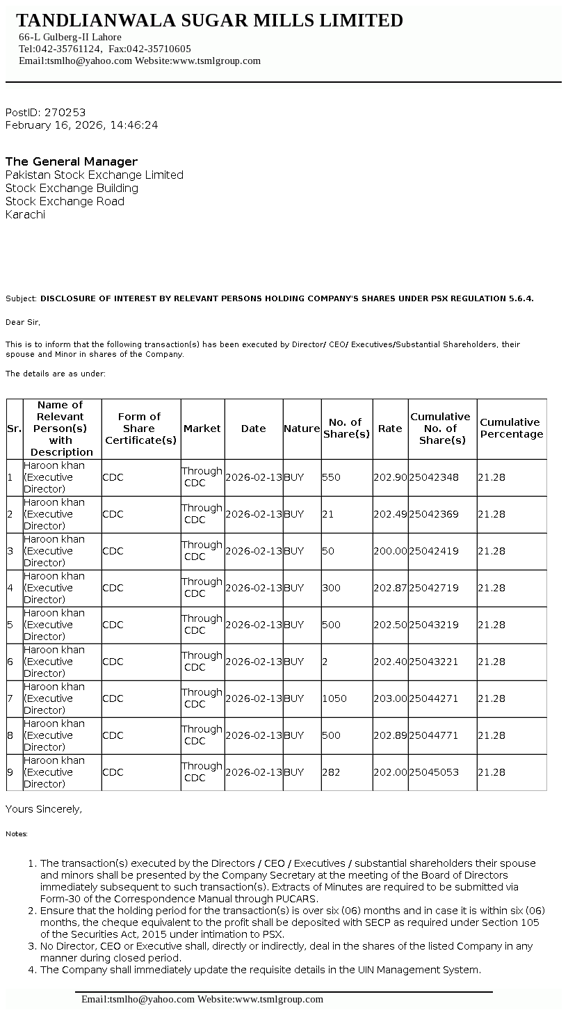 | 2026-02-16 | Disclosure of Interest by a Director CEO, or Executive of a listed company and their Spouses and the Substantial Shareholders u/c 5.6.1.(d) of PSX Regulations | Image PDF |