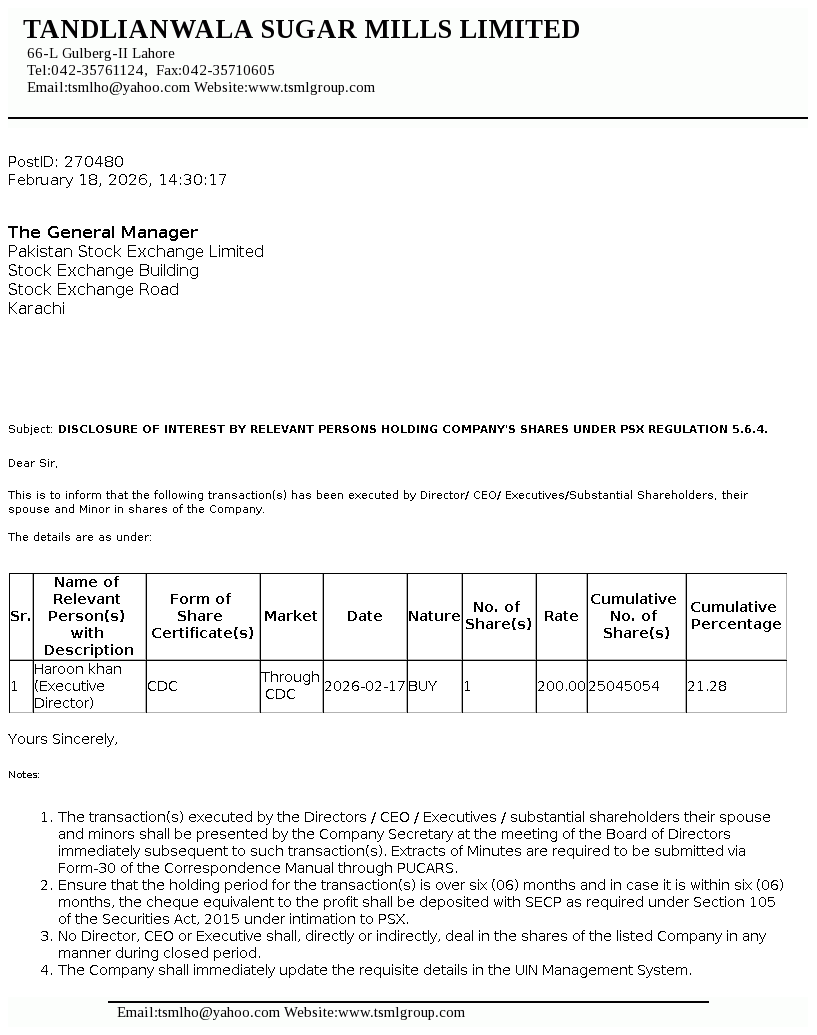 | 2026-02-19 | Disclosure of Interest by a Director CEO, or Executive of a listed company and their Spouses and the Substantial Shareholders u/c 5.6.1.(d) of PSX Regulations | Image PDF |
