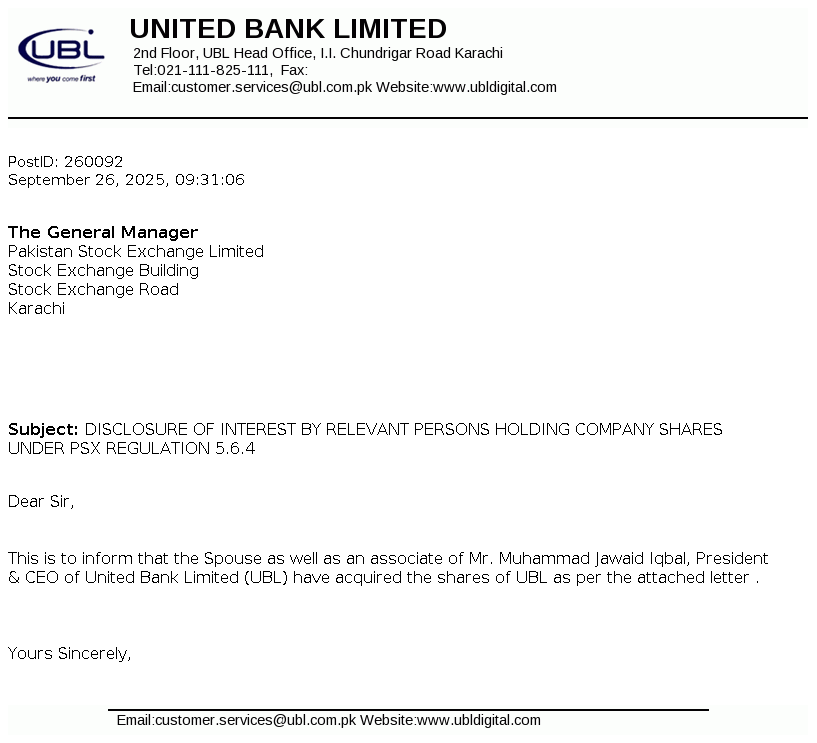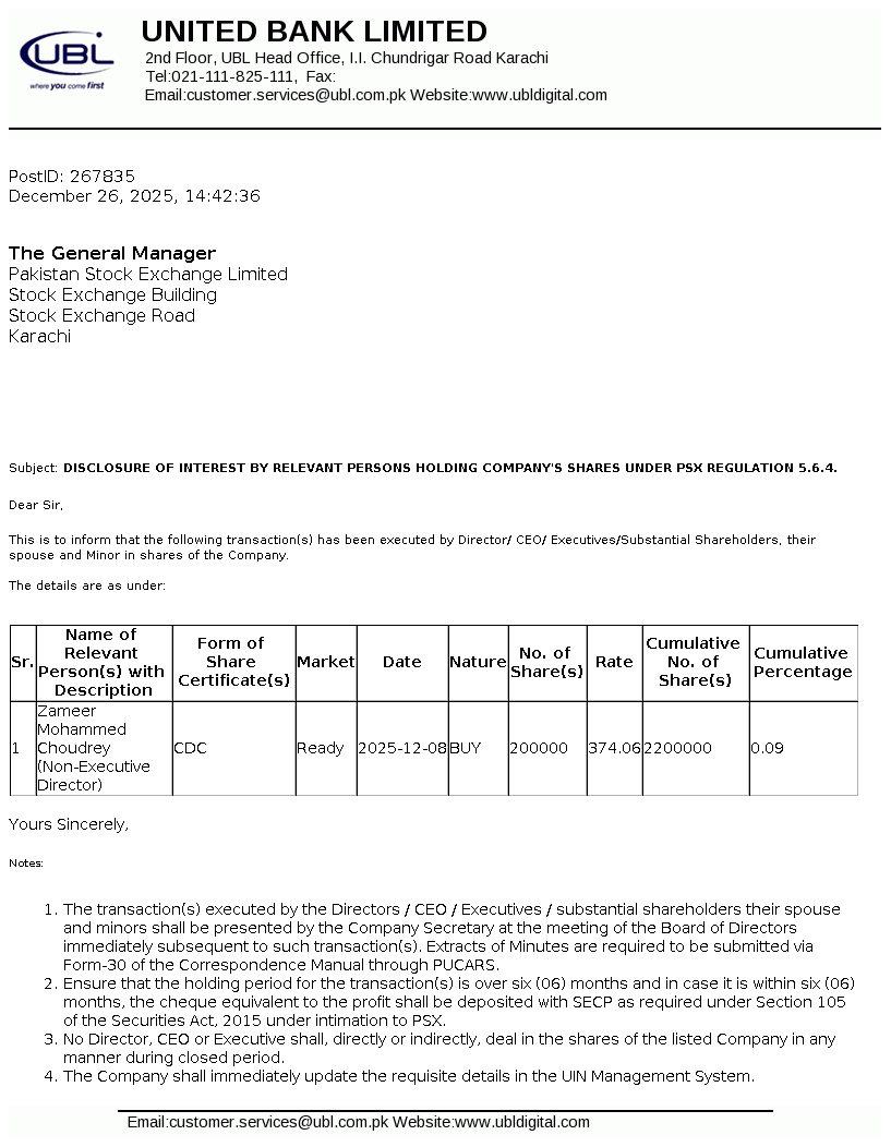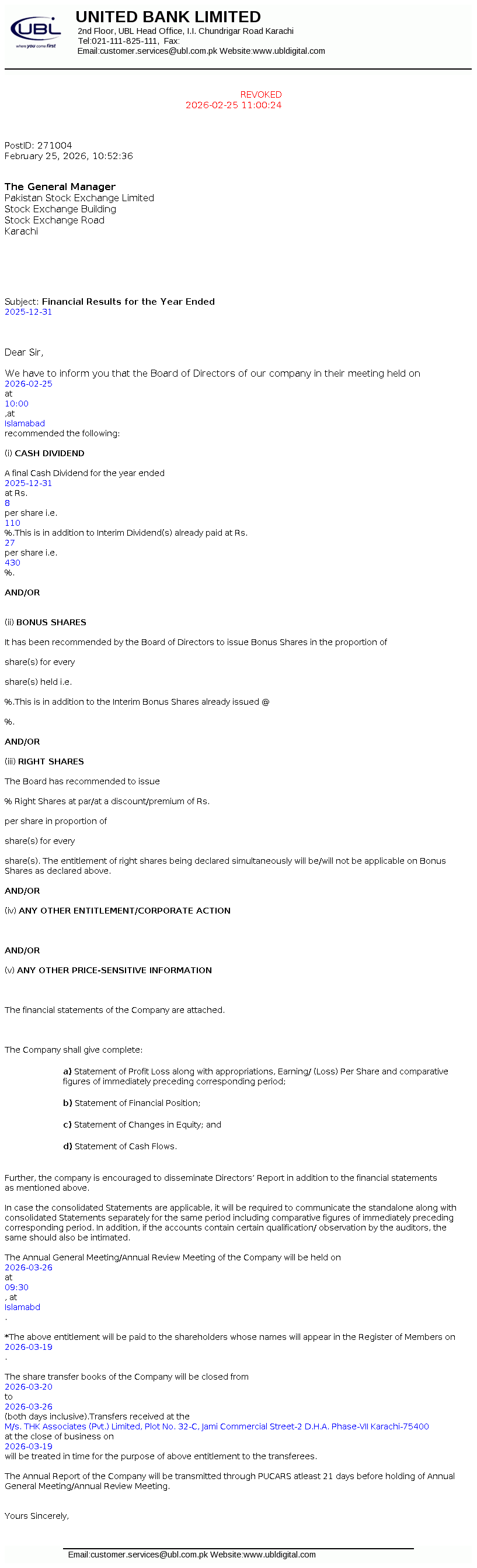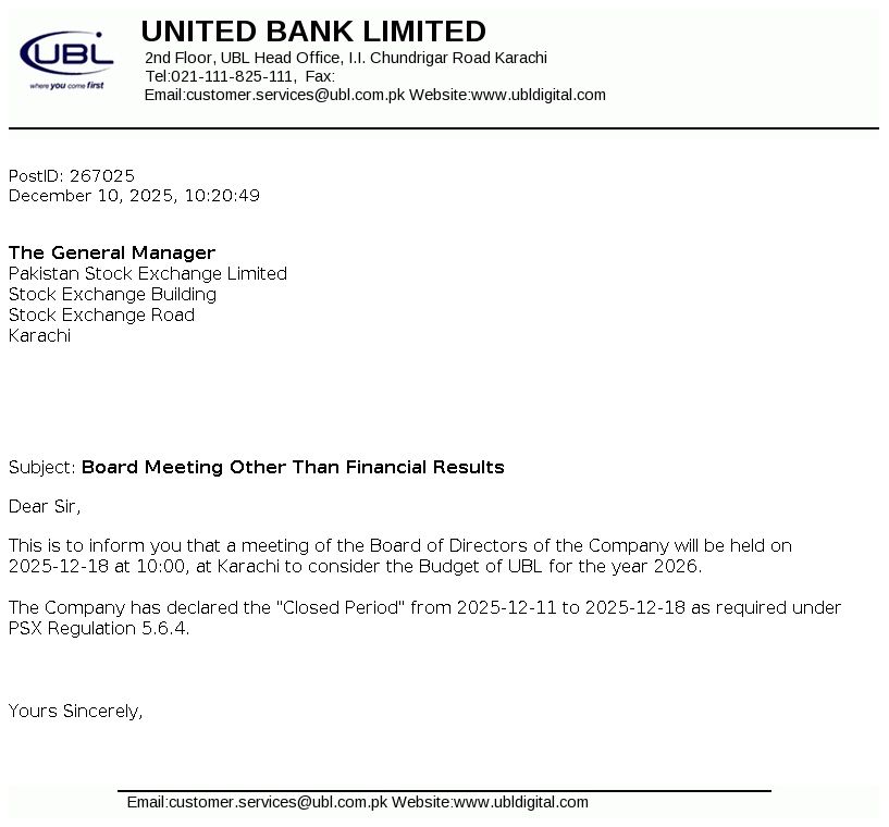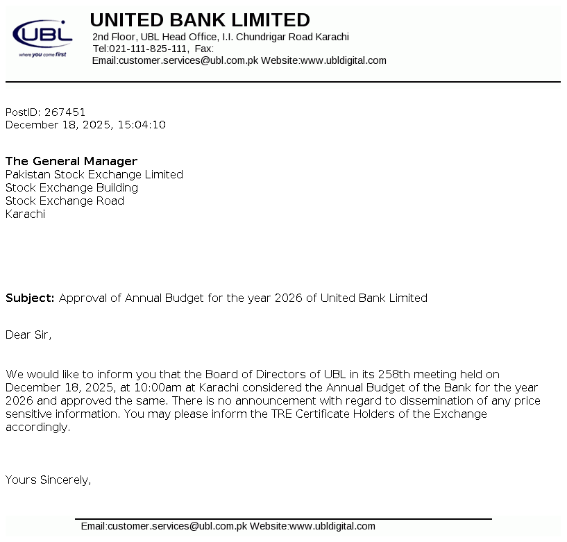 | 2025-12-18 | Approval of Annual Budget for the year 2026 of United Bank Limited | Image PDF |