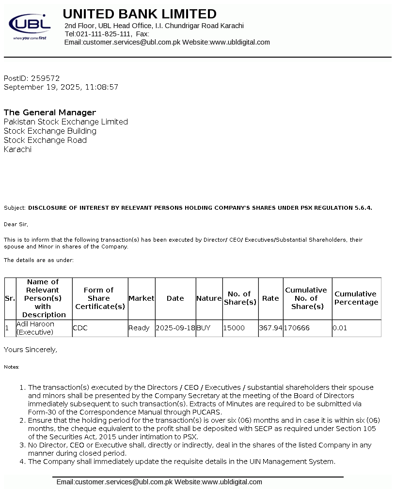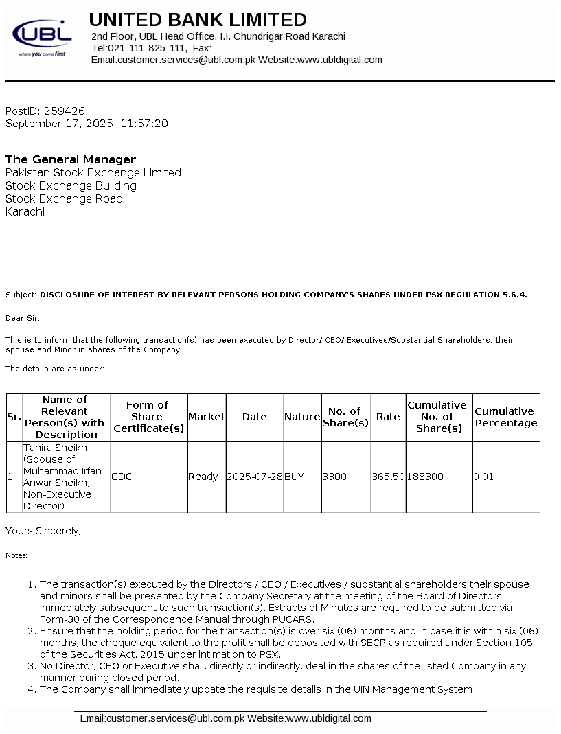 | 2025-09-26 | Disclosure of Interest by a Director CEO, or Executive of a listed company and their Spouses and the Substantial Shareholders u/c 5.6.1.(d) of PSX Regulations | Image PDF |