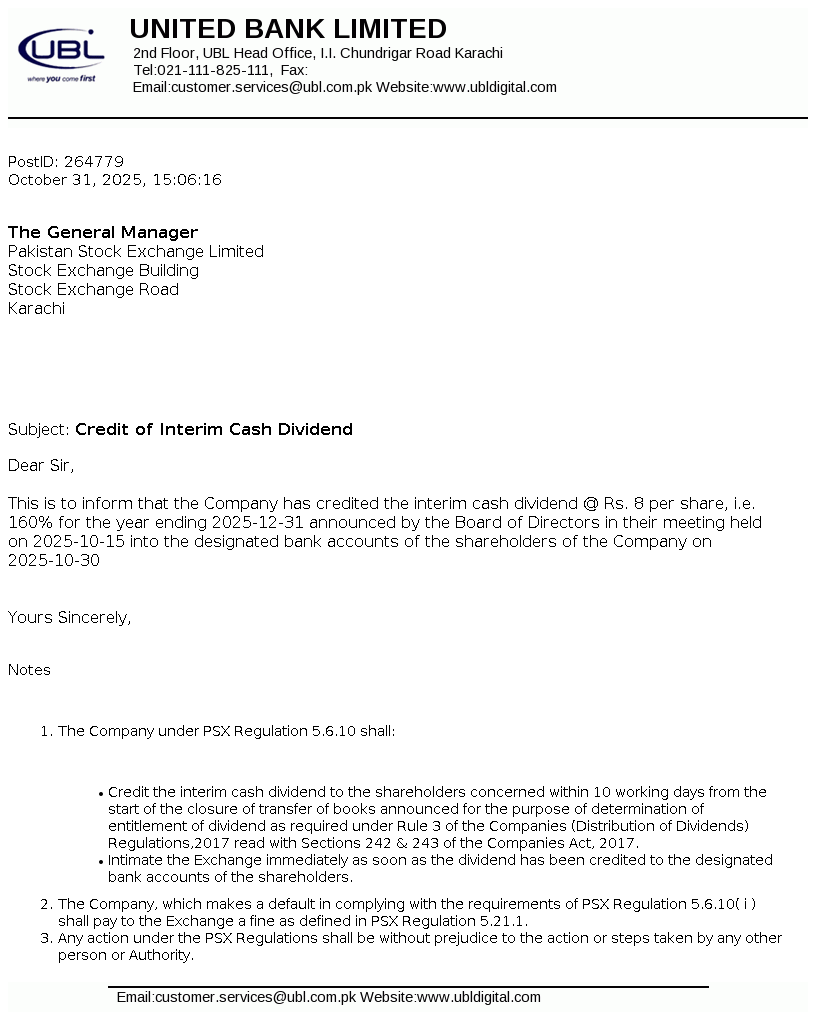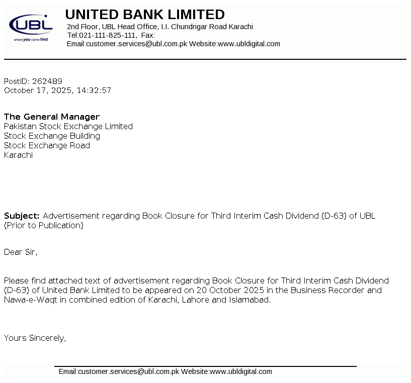 | 2025-10-17 | Advertisement regarding Book Closure for Third Interim Cash Dividend (D-63) of UBL (Prior to Publication) | Image PDF |
