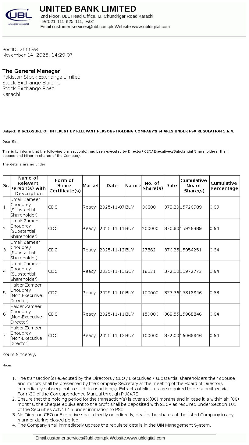 | 2025-11-14 | Disclosure of Interest by a Director CEO, or Executive of a listed company and their Spouses and the Substantial Shareholders u/c 5.6.1.(d) of PSX Regulations | Image |