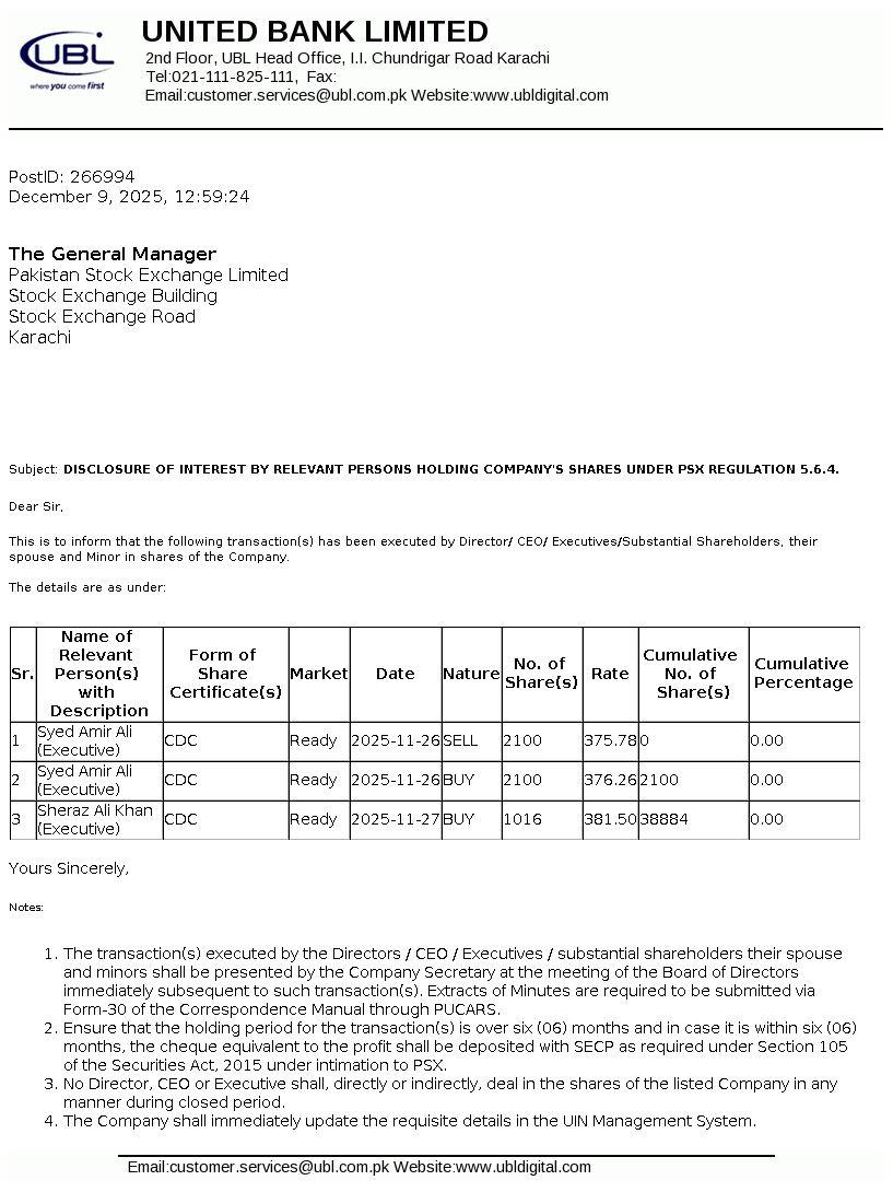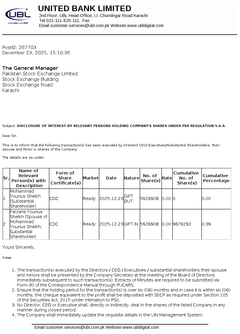 | 2025-12-10 | Disclosure of Interest by a Director CEO, or Executive of a listed company and their Spouses and the Substantial Shareholders u/c 5.6.1.(d) of PSX Regulations | Image |