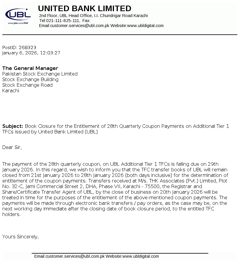 | 2026-01-06 | Book Closure for the Entitlement of 28th Quarterly Coupon Payments on Additional Tier 1 TFCs issued by United Bank Limited (UBL) | Image PDF |