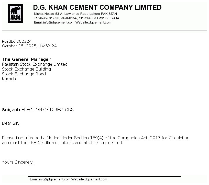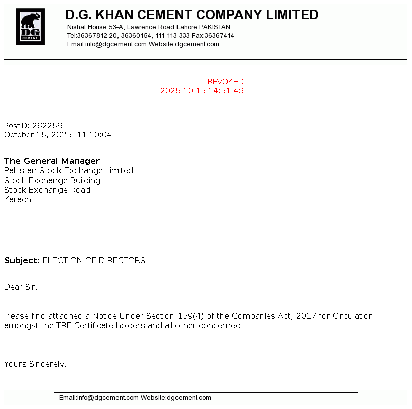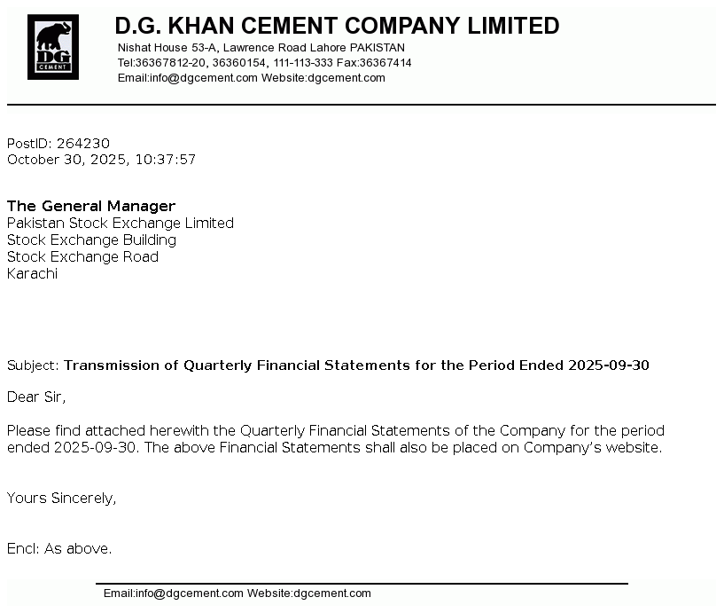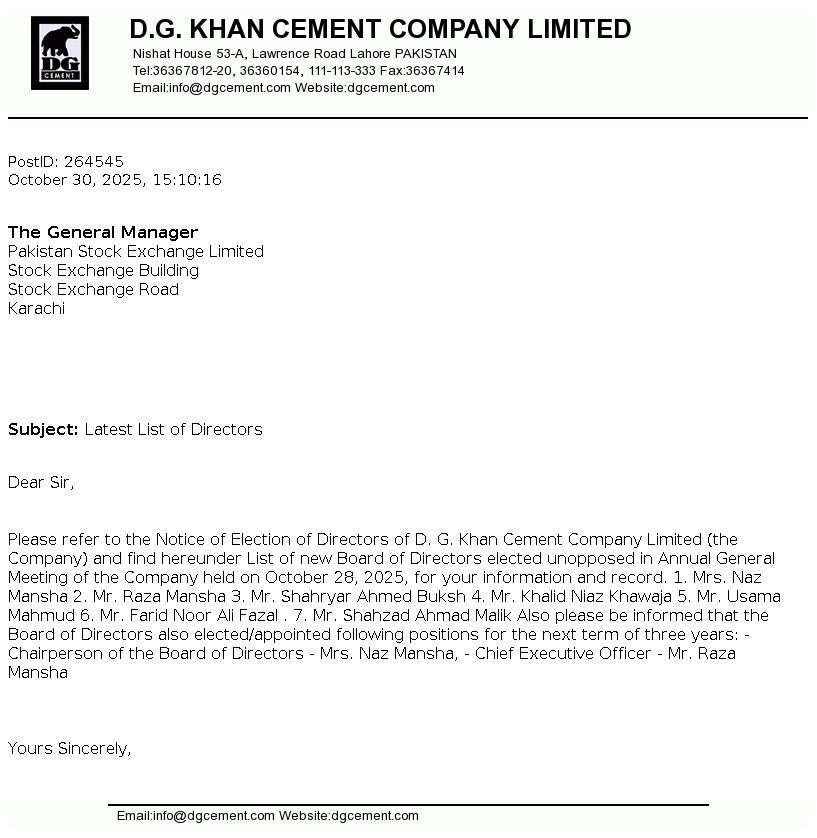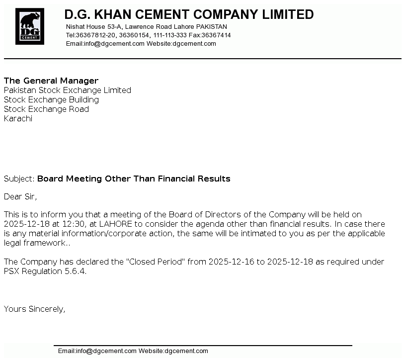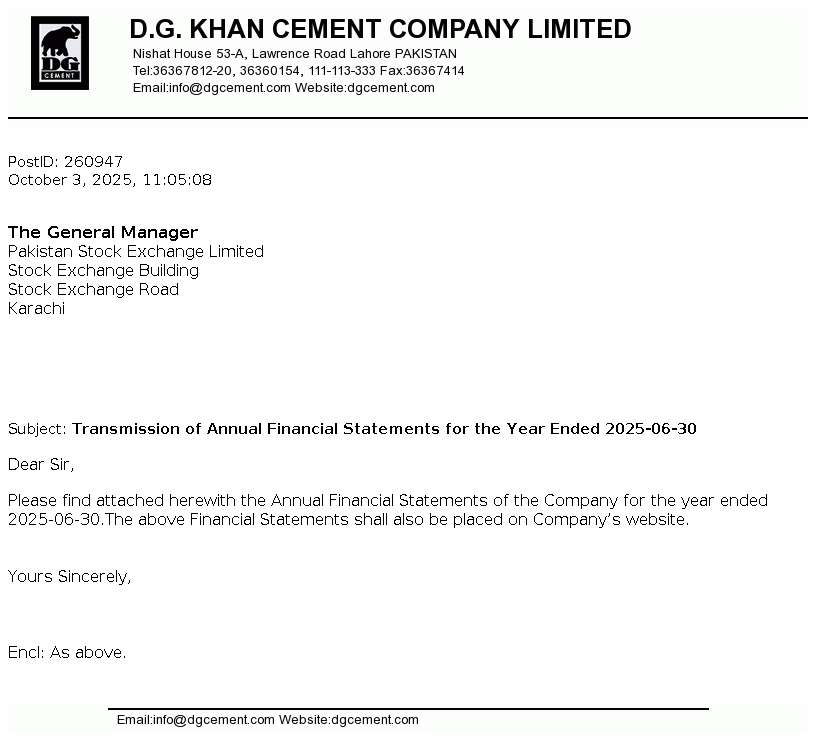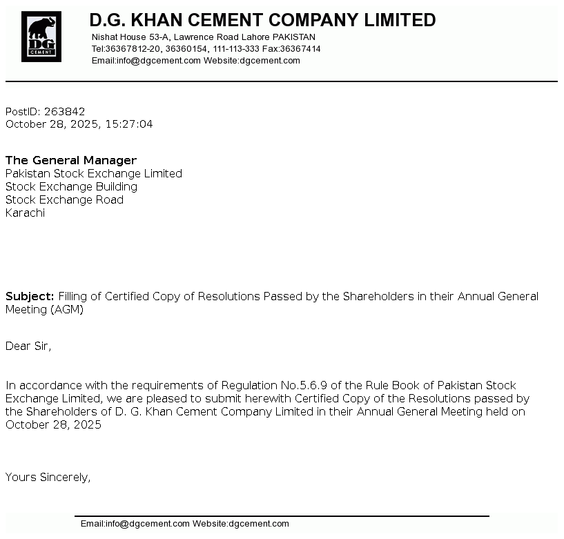 | 2025-11-21 | Holding of Corporate Briefing Session of D.G. Khan Cement Co. Ltd. FY 2025 in Compliance with the requirements of Clause 5.7.3 of the Rule Book | Image PDF |